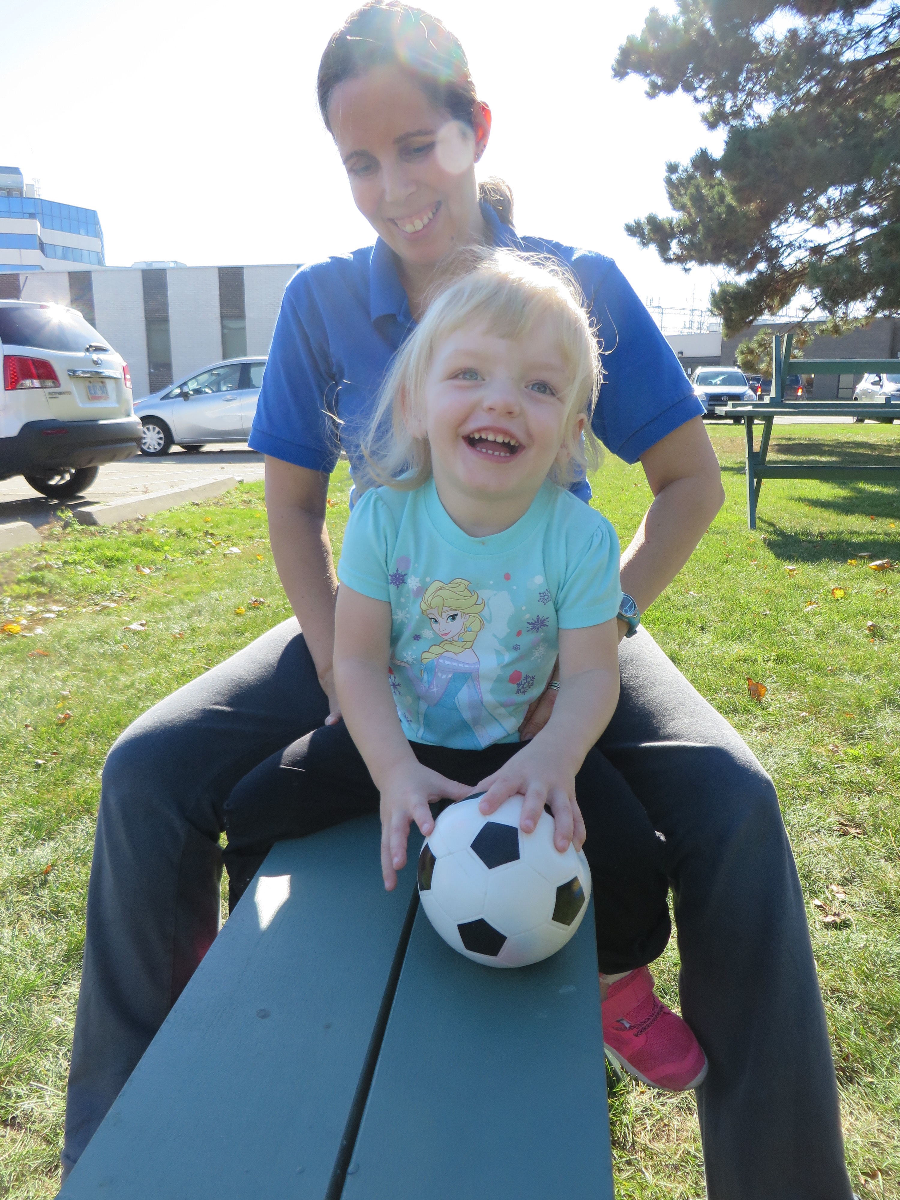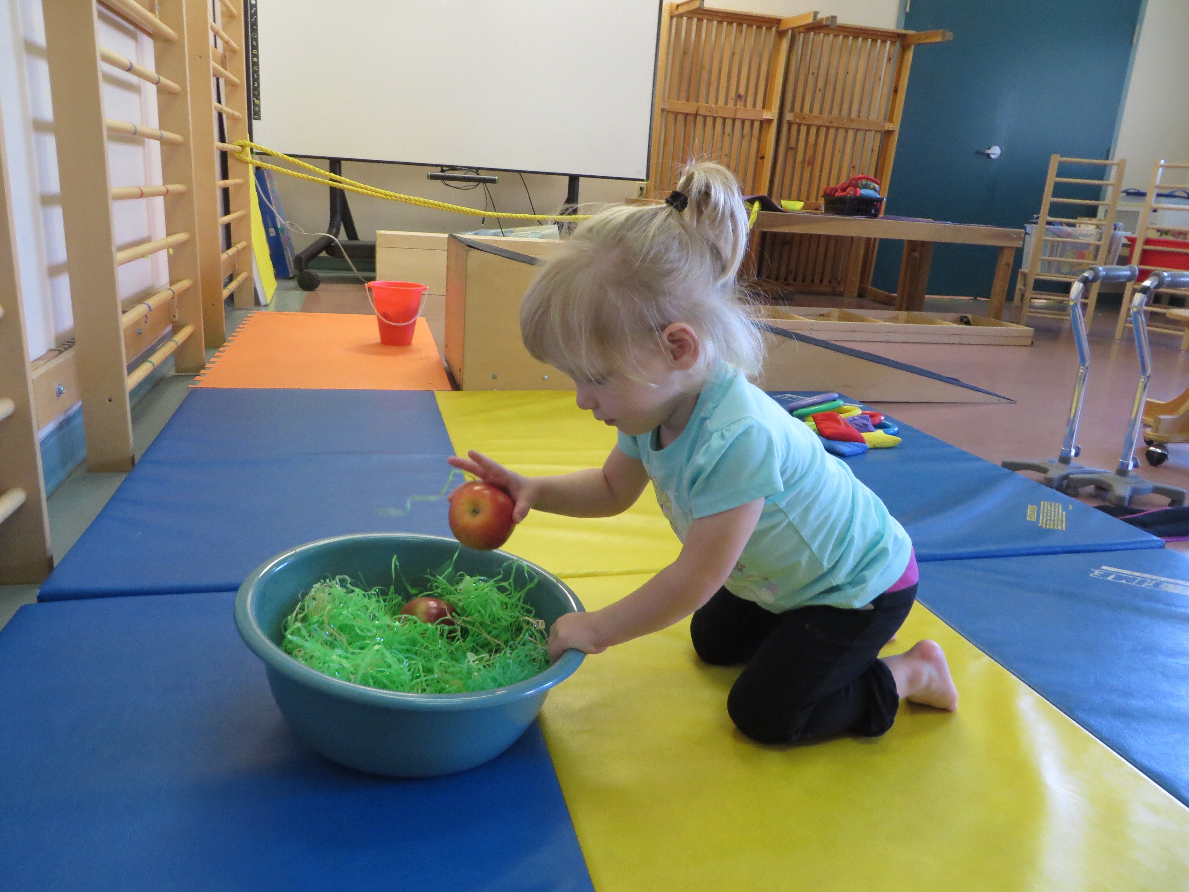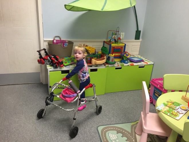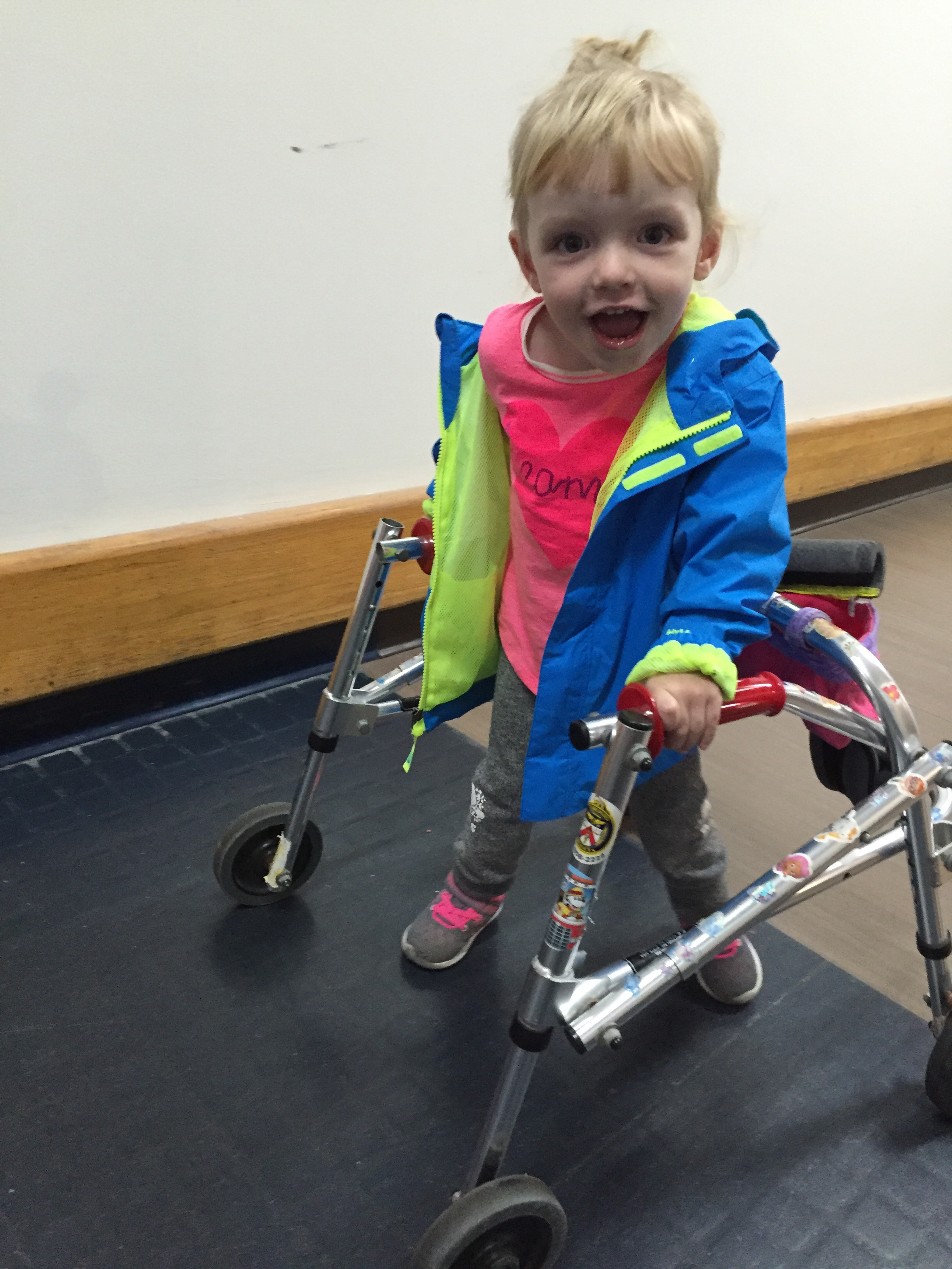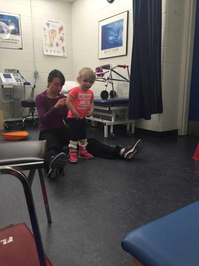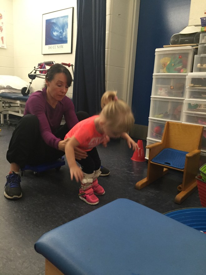 Madison worked with Kate on some new stretching activities to activate and strengthen her dorsiflexion in her feet as well as a bridging activity to strengthen her gluteus. They finished by practicing some walking and learning transitions to sit on the potty independently.