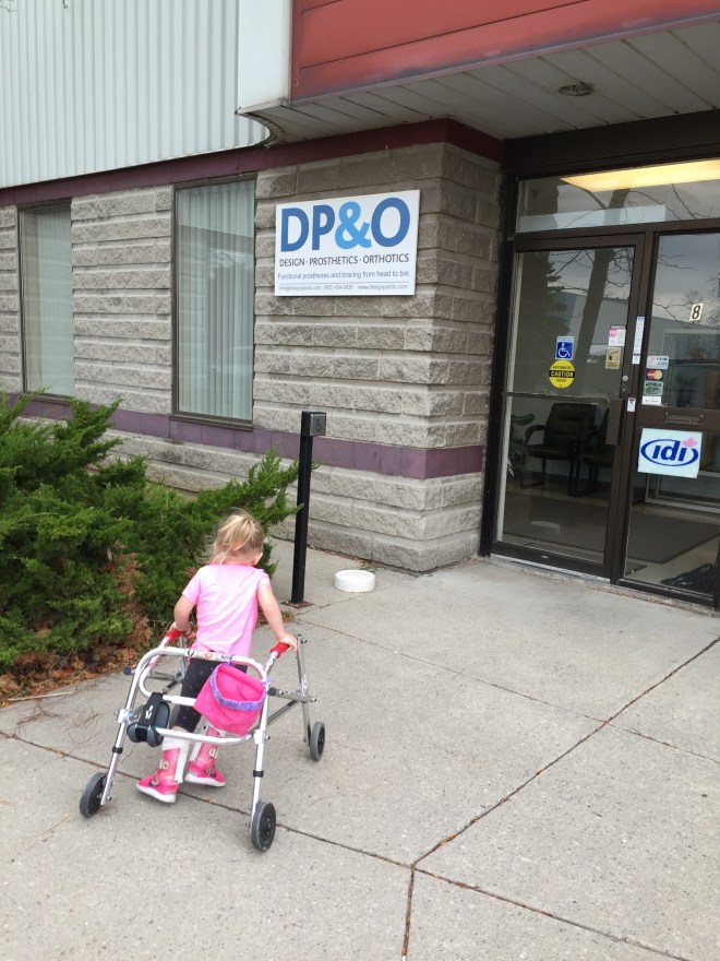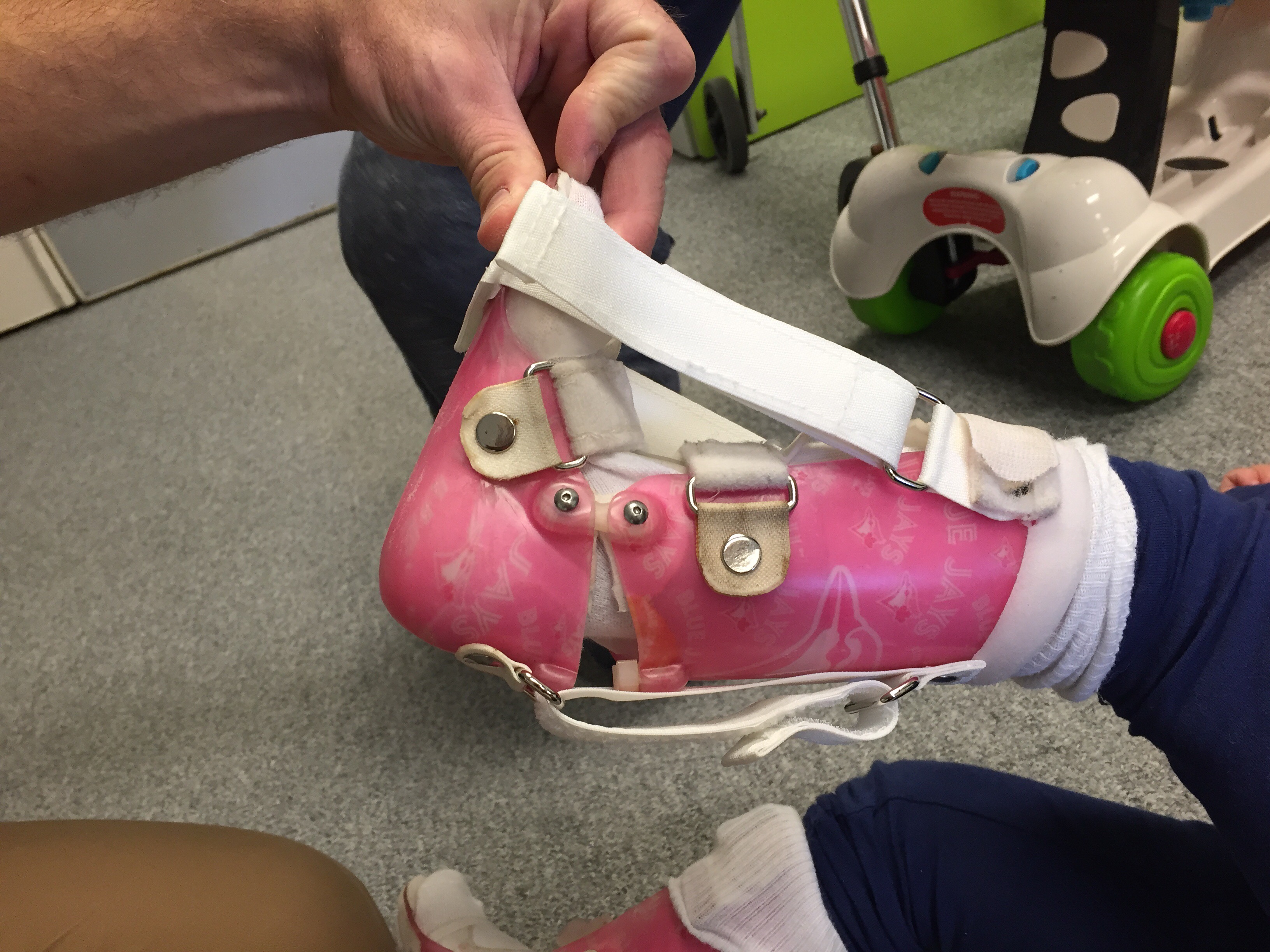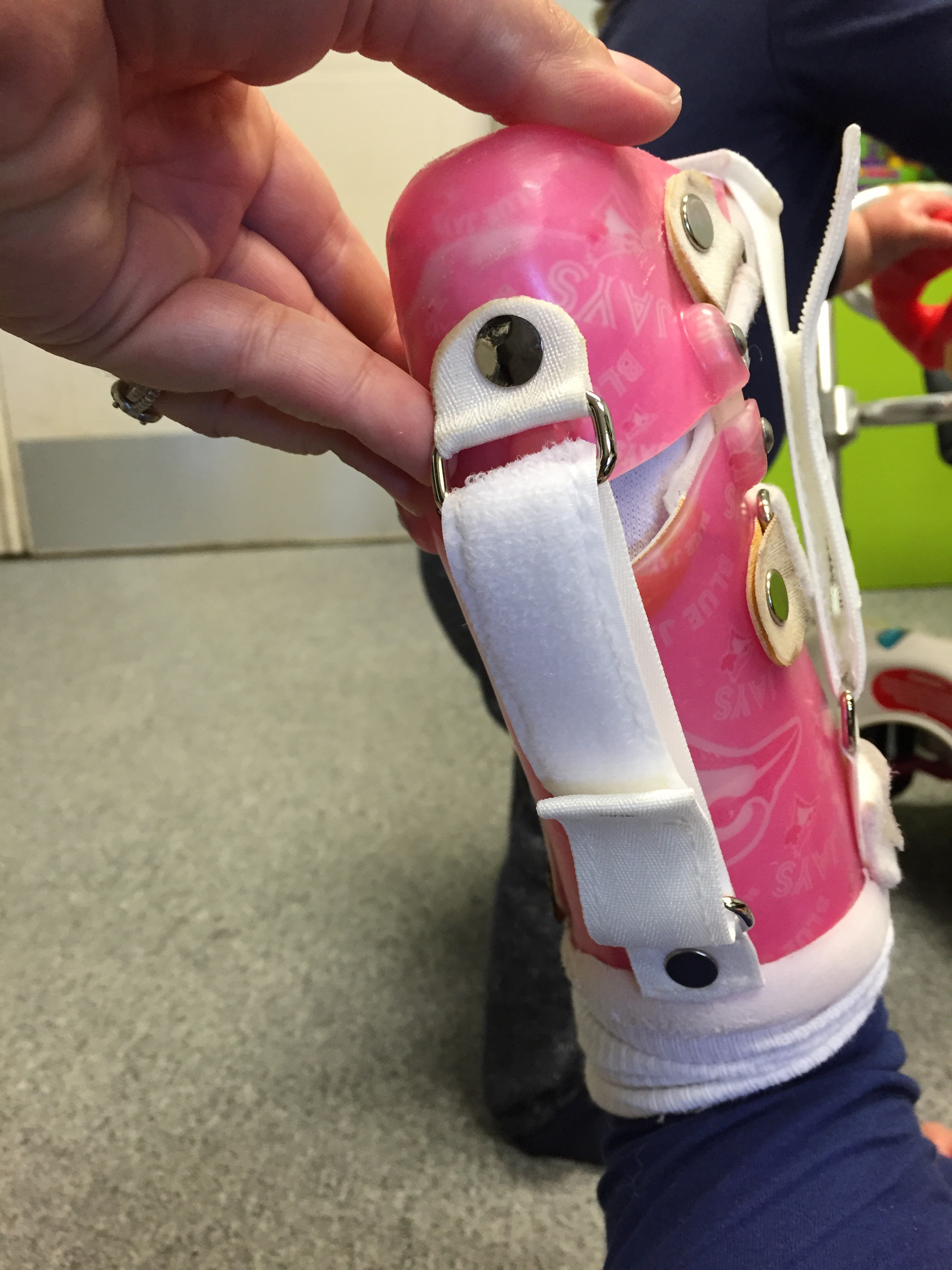 After a while, they went back to Eric’s to pick up Madi’s AFO’s and to review the adjustments made. Eric added stretching straps to the AFO’s to give her heal cords and calfs a good stretch. He also added a strap to the back to lock up the hinge so that her feet stay in proper alignment to protect the tissue on the bottom of her feet from shifting to incorrect positions when transitioning from the floor to standing and walking.
