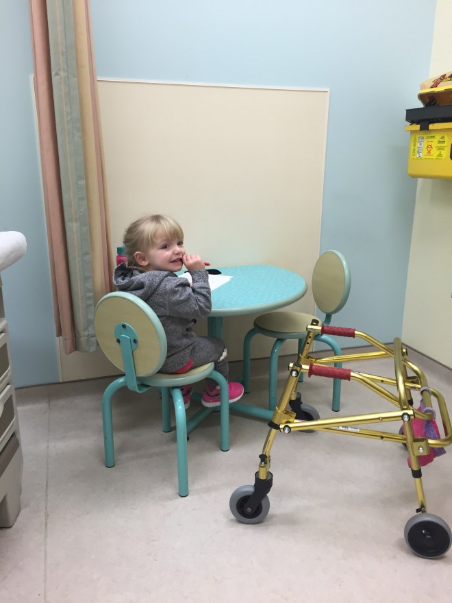 Madison’s battle for OHIP coverage continued today with a visit to McMaster Children’s Hospital in Hamilton. About a month ago Madison was denied OHIP coverage for SDR surgery until she gets the out of country OHIP forms signed by a peadiatric neurosurgeon. So today she travelled to meet with a doctor who has the ability to approve coverage to submit to OHIP. She was a bit nervous to meet the new doctor and said frequently “I don’t want to get fixed today”