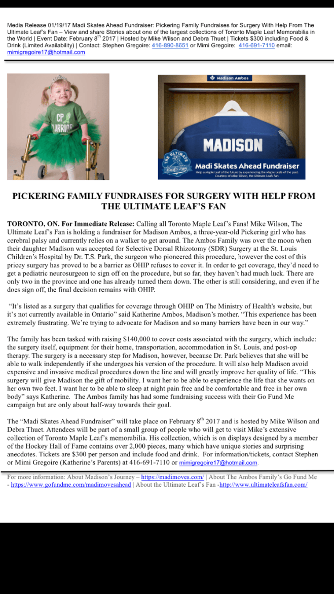 A massive team of people have been supporting Madison and helping her journey to SDR slowly become a reality. One of those people is cousin Meredith who created and distributed a press release today. It was shared with most major newspapers in Toronto as well as smaller community papers in the Durham area. It highlights the upcoming fundraiser at the house of ‘The Ultimate Leafs Fan’ who is encouraging press to attend the event. Hopefully the press release draws some attention and interest. Thank you Meredith!!!