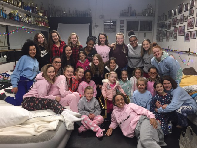 Once the birthday boy was in bed, Madi headed to a sleepover! All the “big girls” at DLDA – Madison’s dance studio held a sleepover fundraiser tonight to support Madison’s upcoming surgery. They were all in onesies and gave Madi big smiles and hugs when she arrived. Mommy and Madi thanked everyone and she gave them cupcakes to say a big thank you for all their support and love.