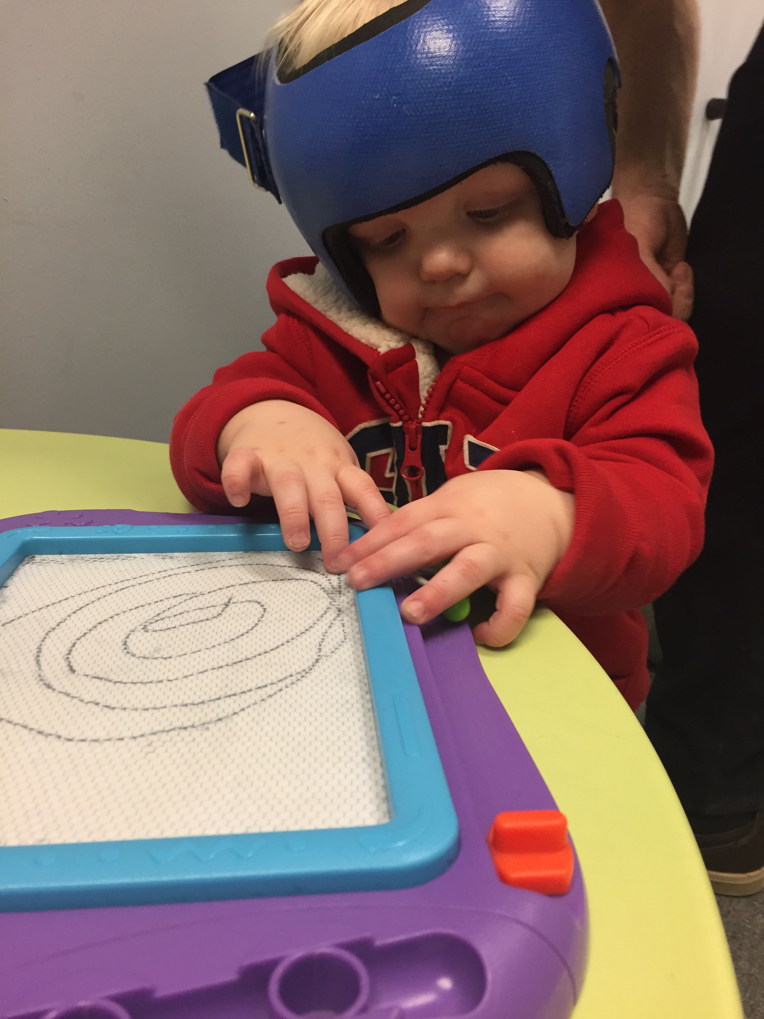 Jack had a visit with Eric to get his last helmet fitting. Only a few more months and his helmet should be done with.