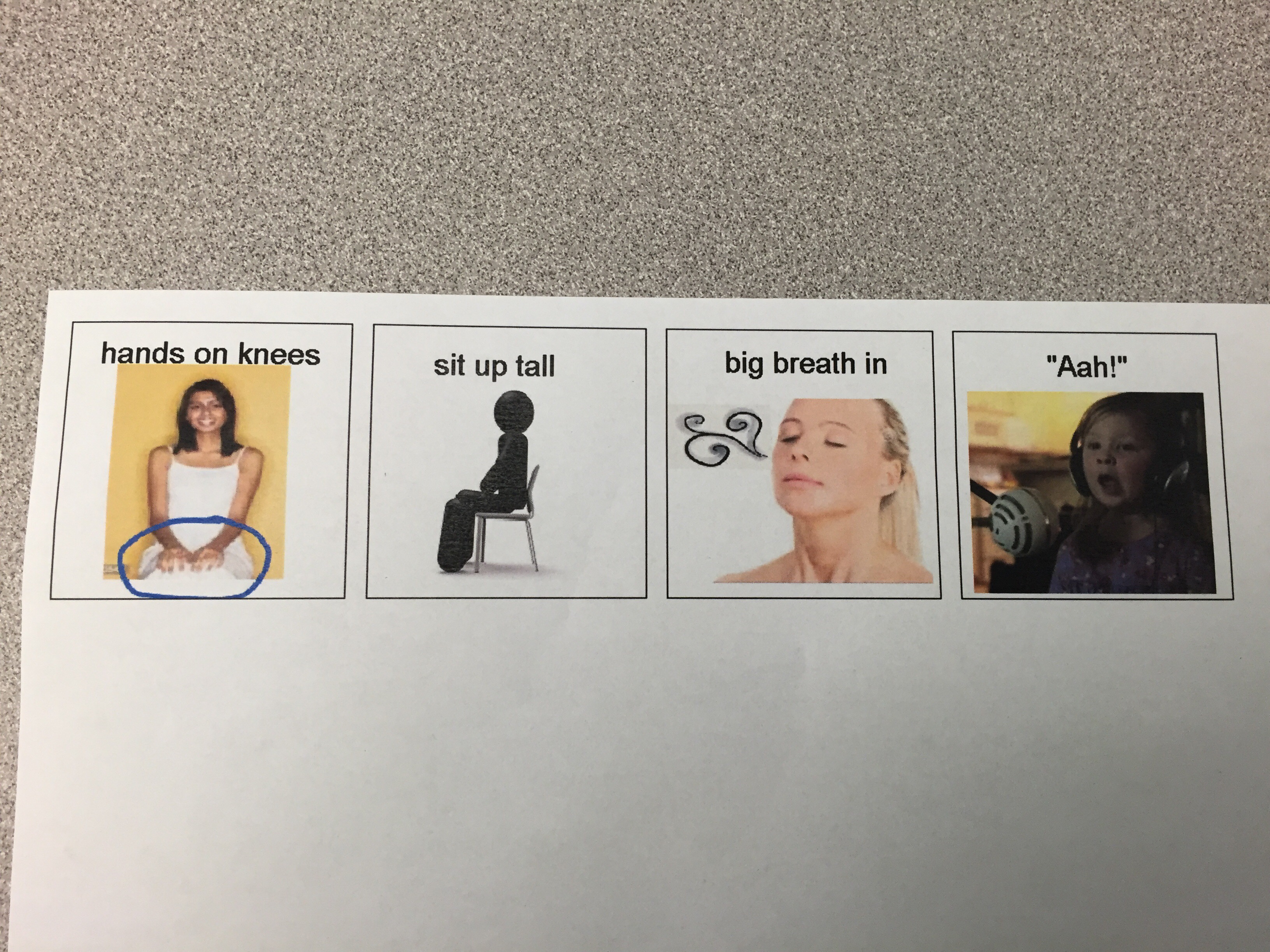 She was also taught a sequence is quue’s today to help with the clarity and length of sound when sitting. She was very receptive to trying the strategies and sub vocalized them every time which was awesome to see! “Hands on my knees, sit up tall, big breath in and GO!”