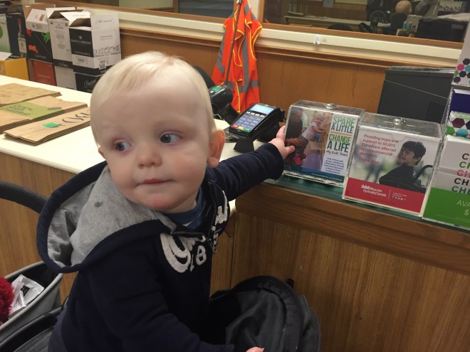 Mommy & Jack attempted to get his passport picture done for St Louis…2 hours later after laps around the mall, a cheap mall ride, spotting his sisters pic in the LCBO and multiple attempts at a photo…this was the best one