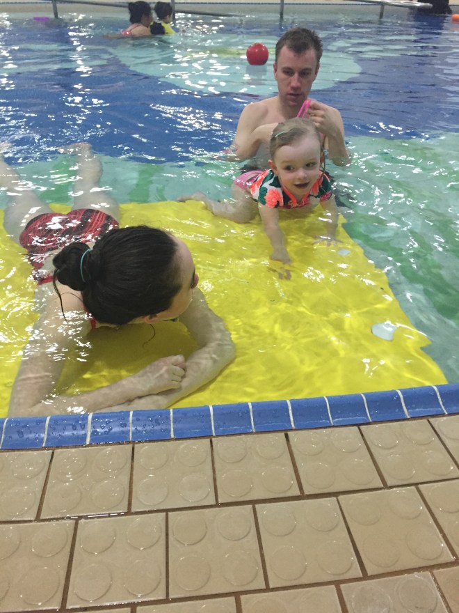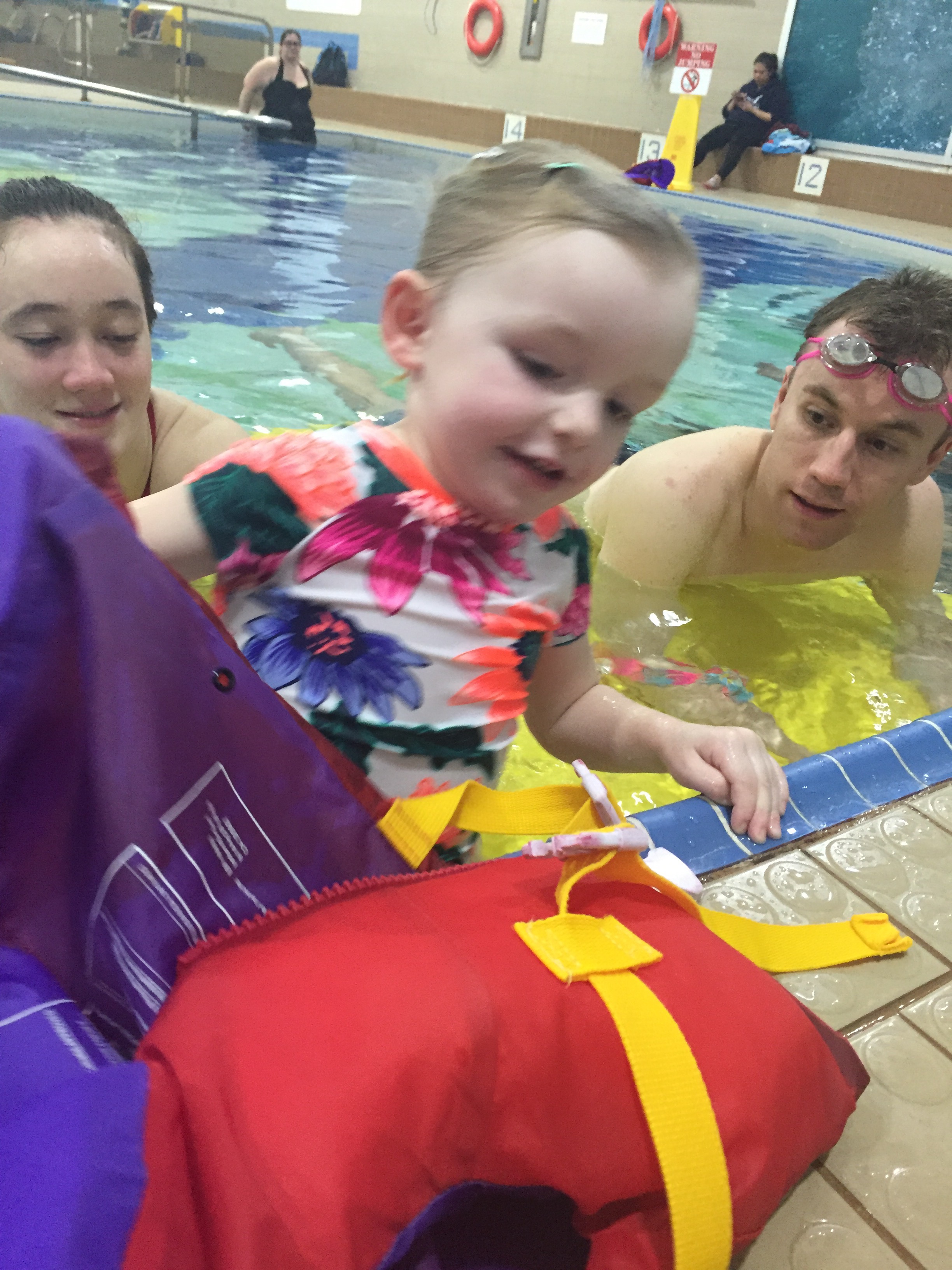 After a nice play and visit with Nana, Madison headed back to Variety Village for a swim with Ryan and Jessica. She did some floats, bobs, transitions and walking. She was tired at the end of her busy day, but she had no leg cramps at all today and legs were more relaxed which made for a nice day.