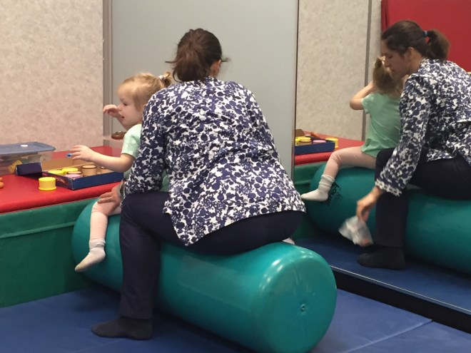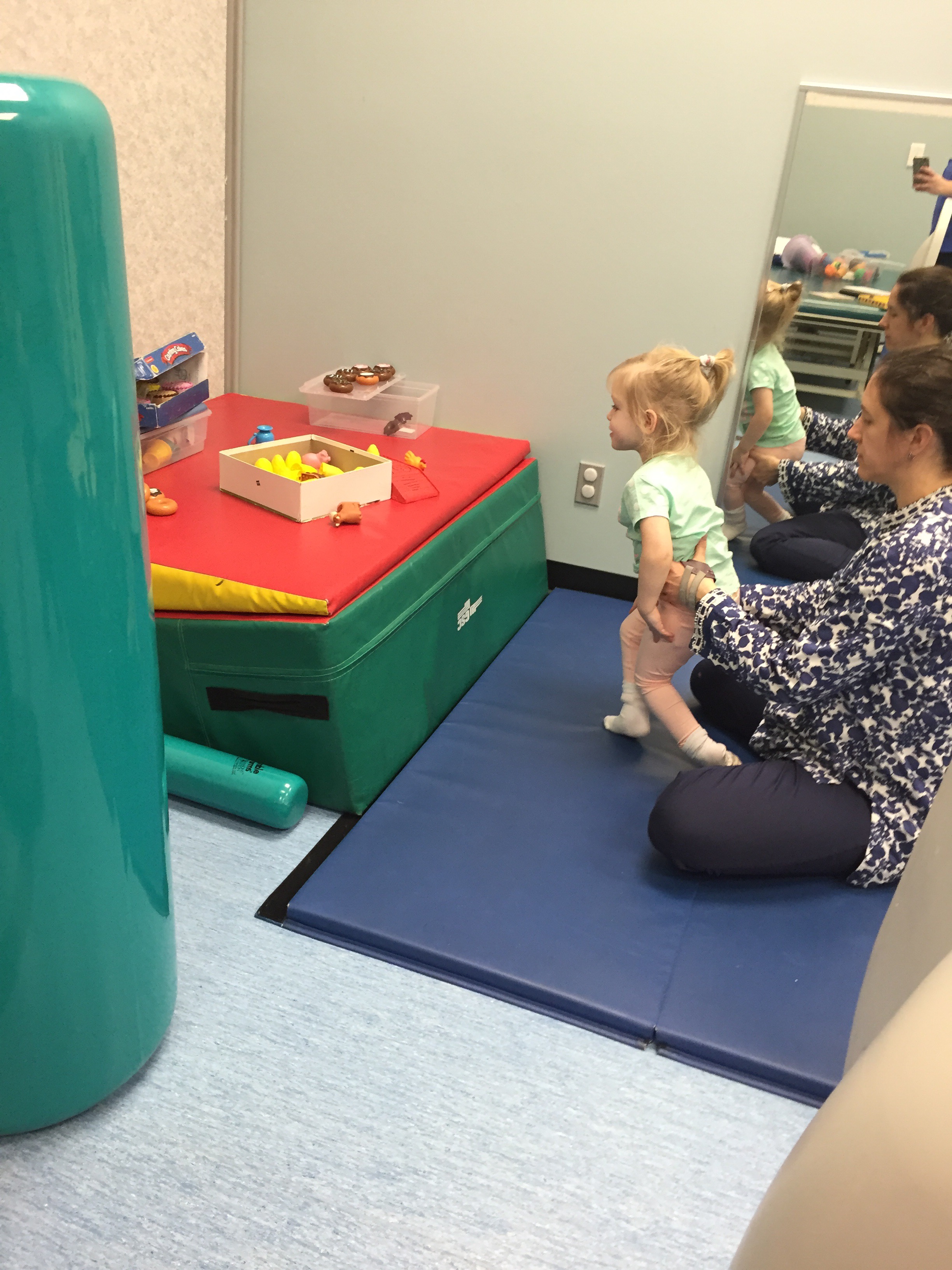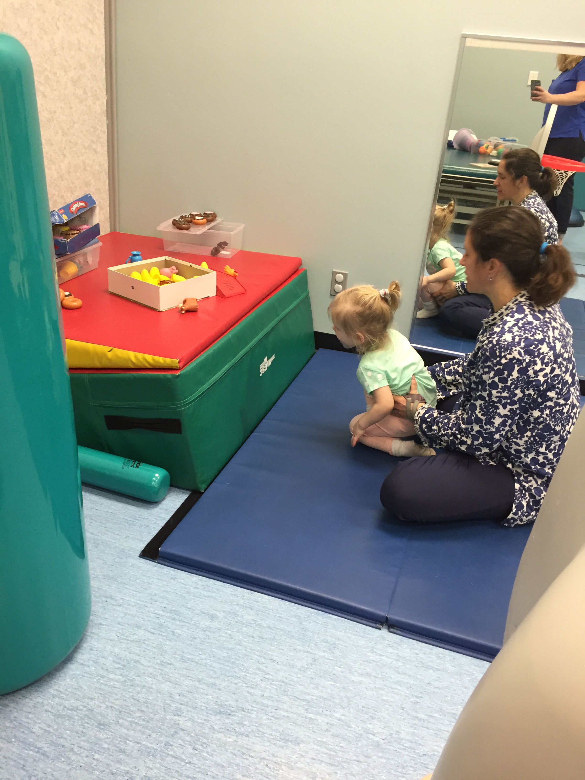 Madi worked on some good stretching and strengthening exercises today at Grandview from her pre-op booklet. Her “skill of the day” that was focused on was learning to stand up from the floor.