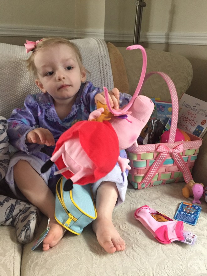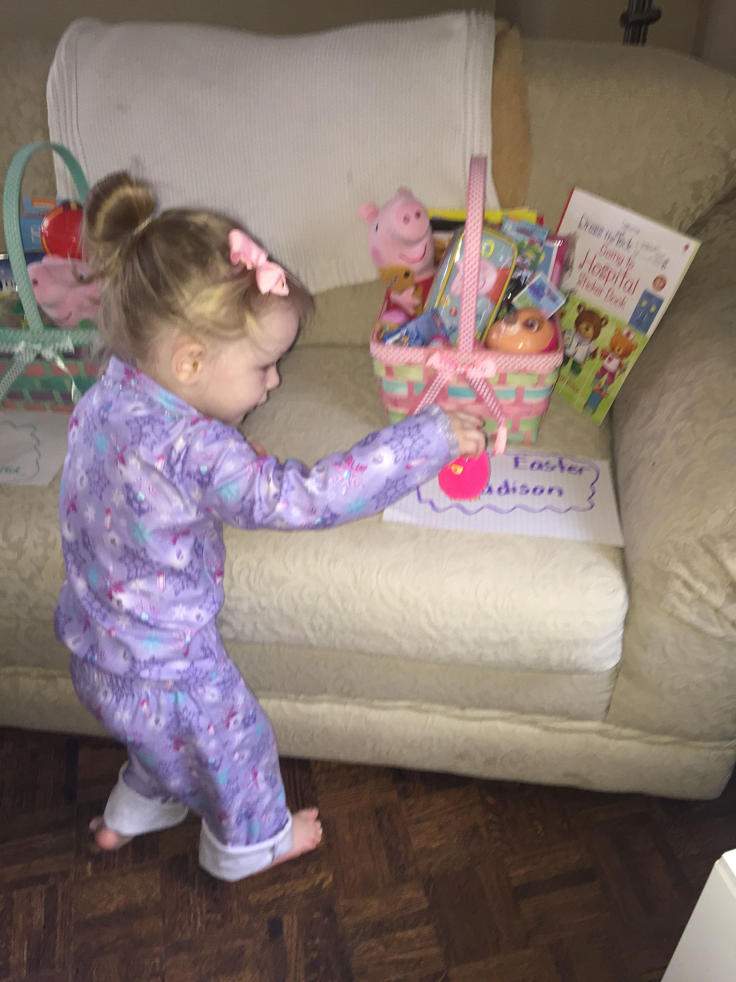 Madi had a great morning at school. She zoomed around her class all morning with lots of energy in her walker and asked to be the teacher during calendar time. Madi stood up at the calendar and used the pointer to tell the date and sang the calendar song all by herself! Madi finished her school morning with a visit with Tiffany who gave her some books to have with her at the hospital.