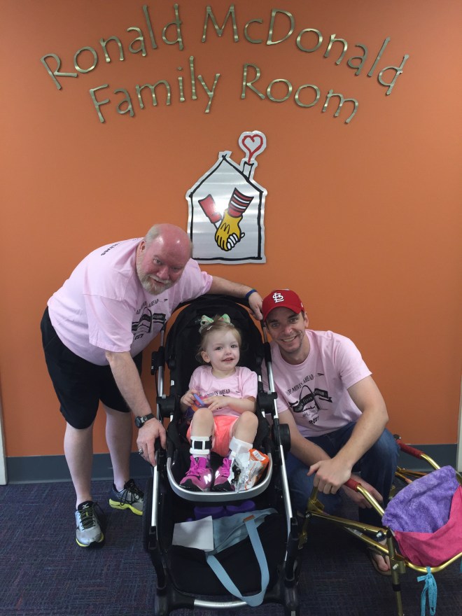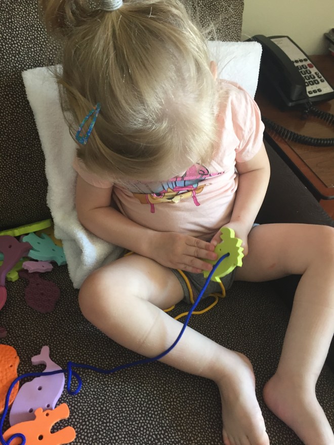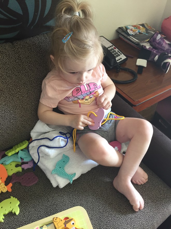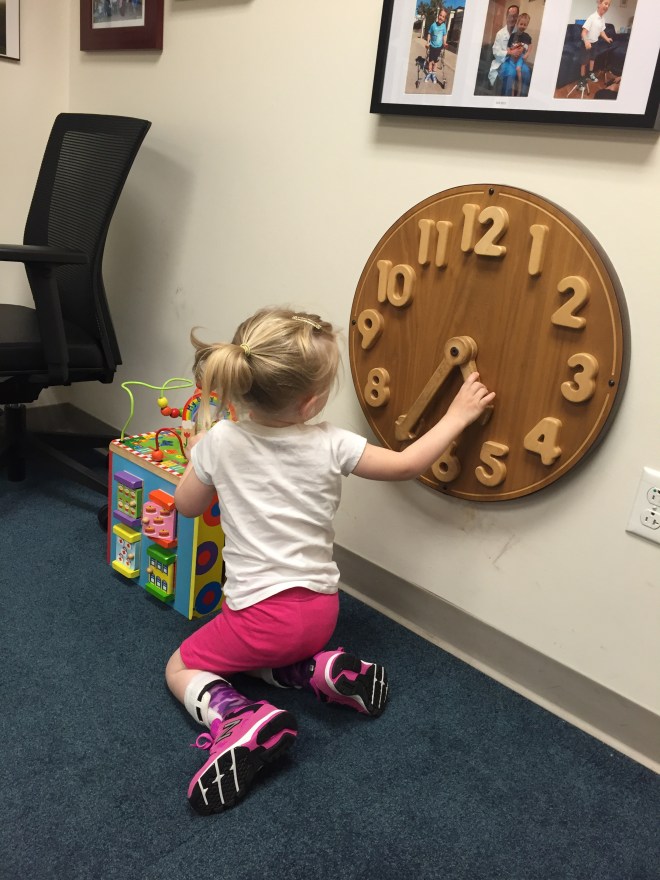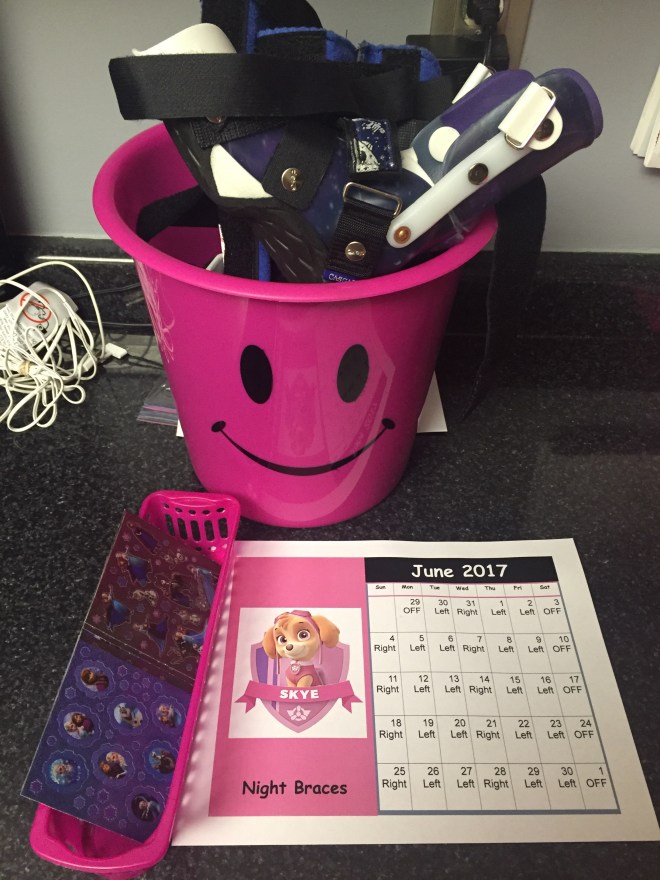 Her pink brace bucket and calendar with stickers will stay next to her bed. The calendar tells her what leg is wearing the equipment each night and once she has everything on, she can put a sticker on the date. It was recommended she wear more on her left leg and to have one night off a week.