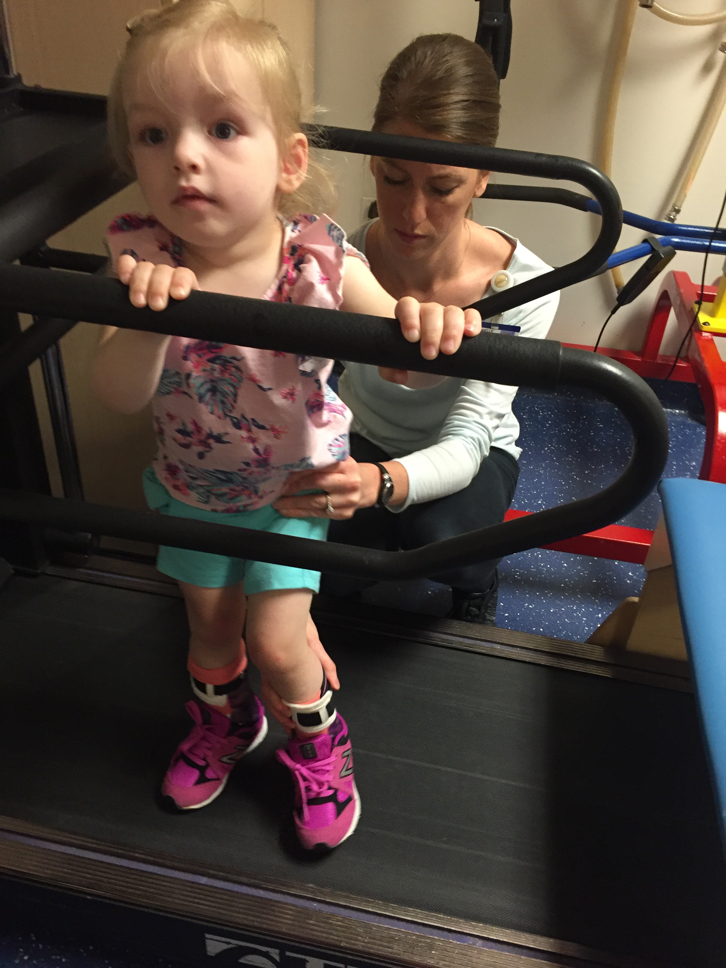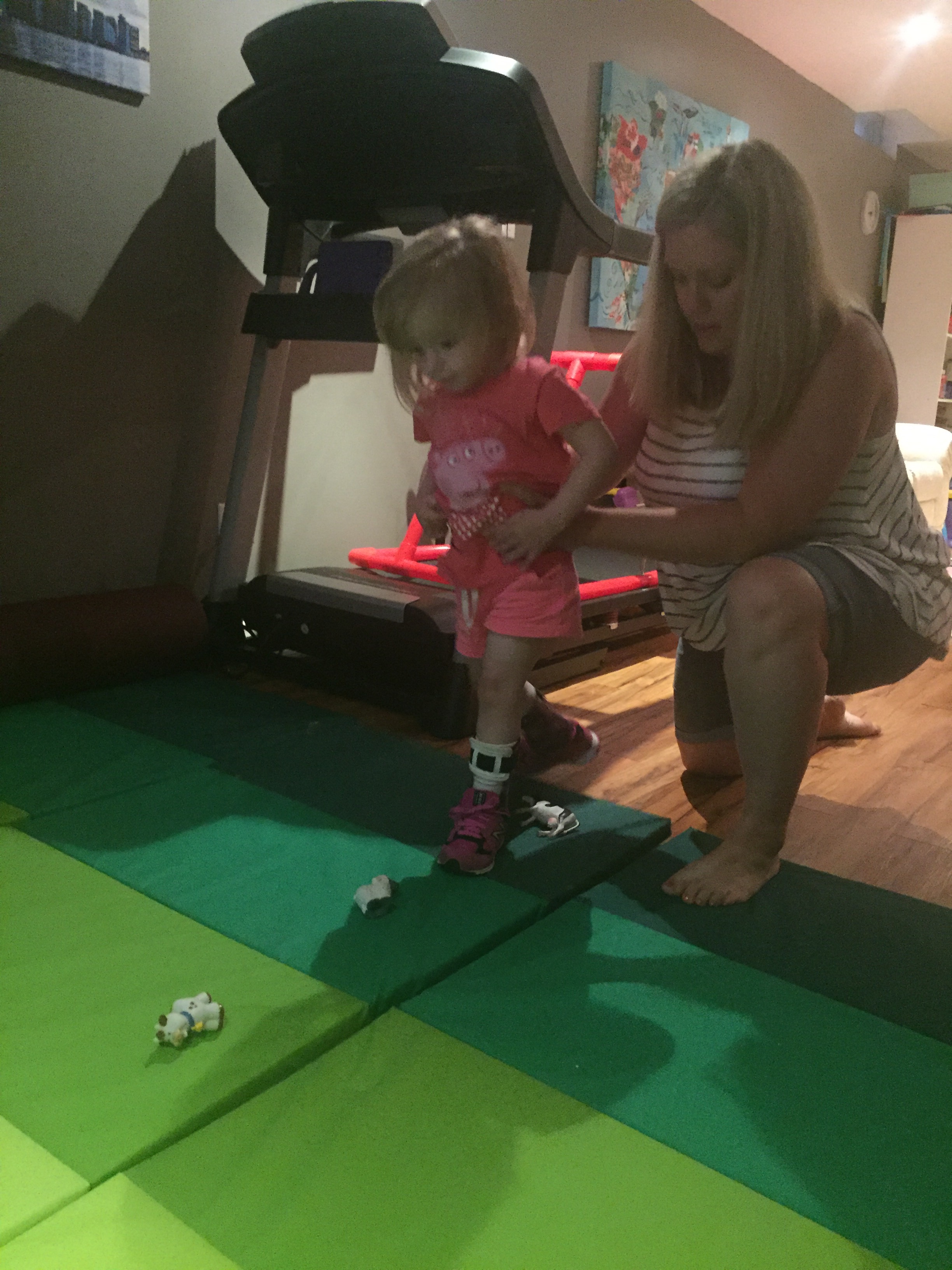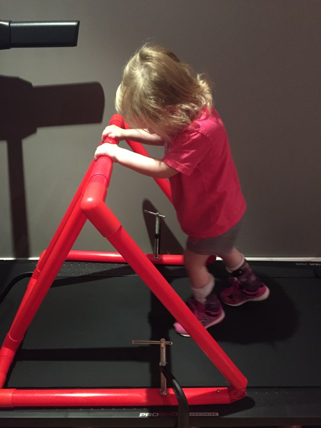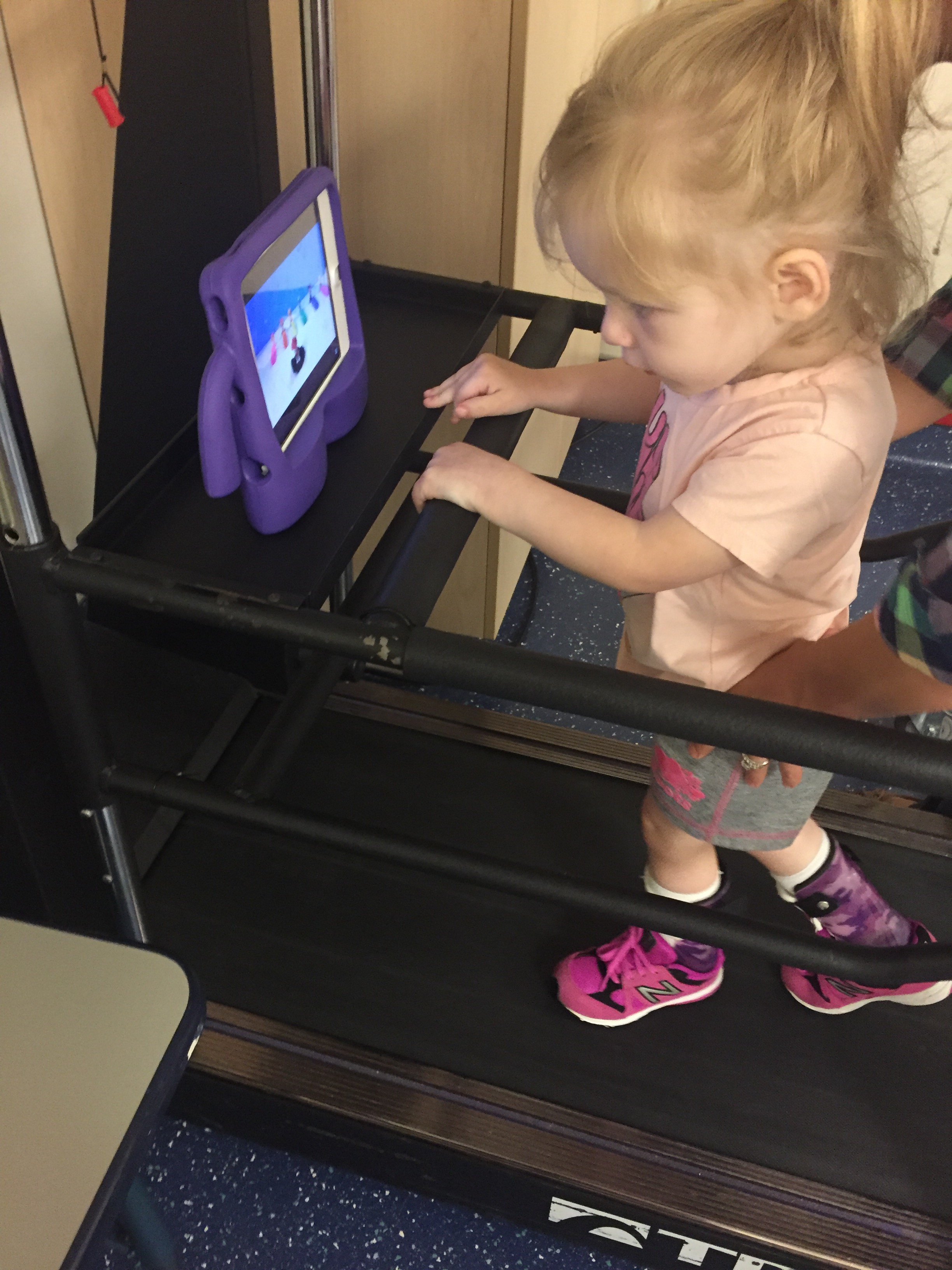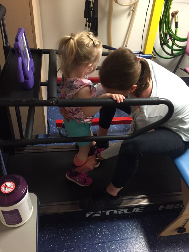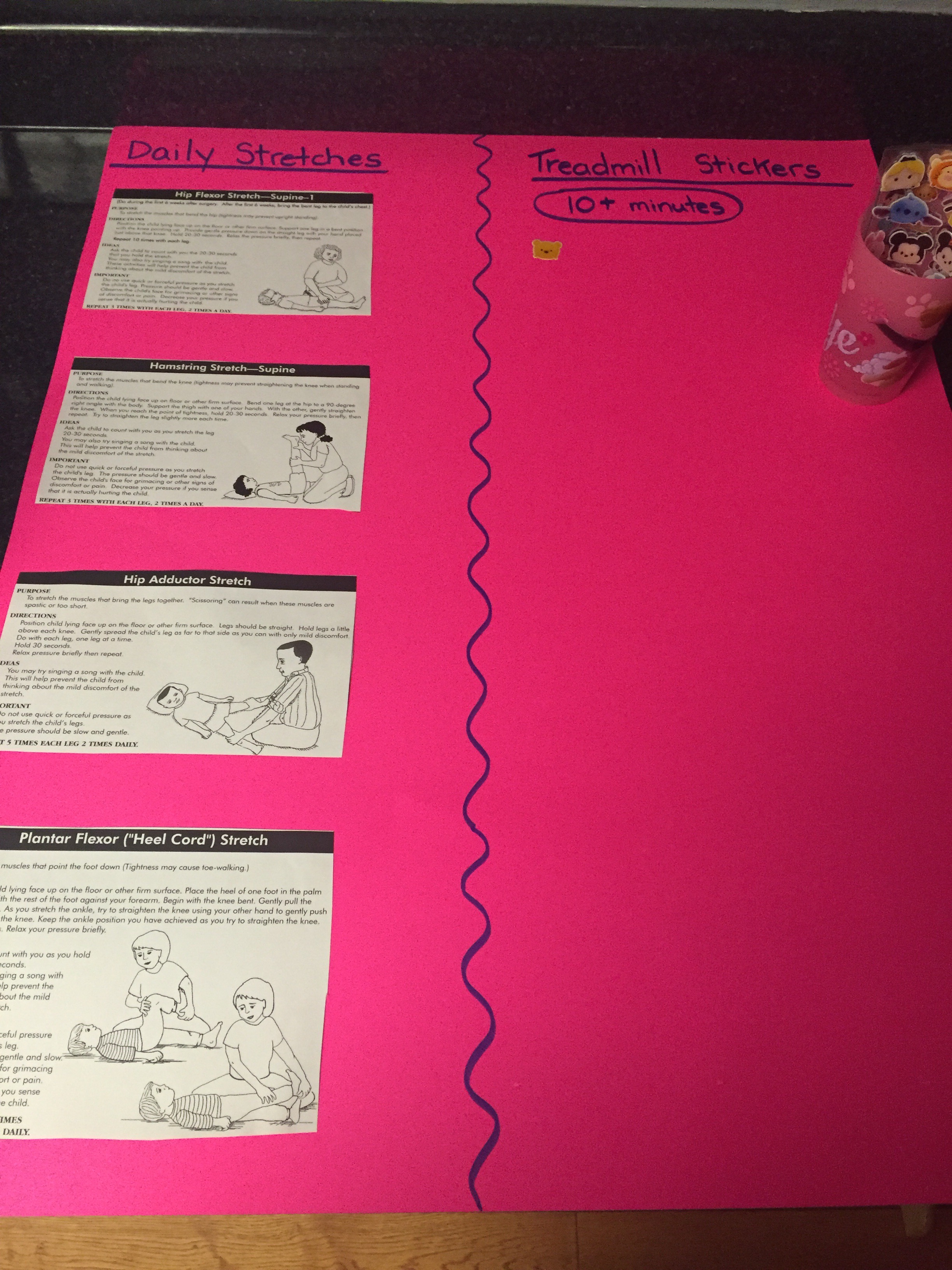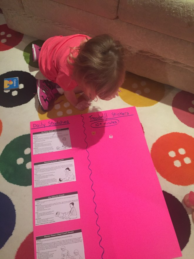 Here is her stretching guide to help facilitate her daily stretches. She will also use her treadmill 5 days per week to practice walking forwards, sideways, backwards and eventually on an incline. If she walks for more then 10 minutes she can put a sticker on her board. Once she collects 10 stickers she can pick a new app for her iPad that we use to distract her when walking or stretching.