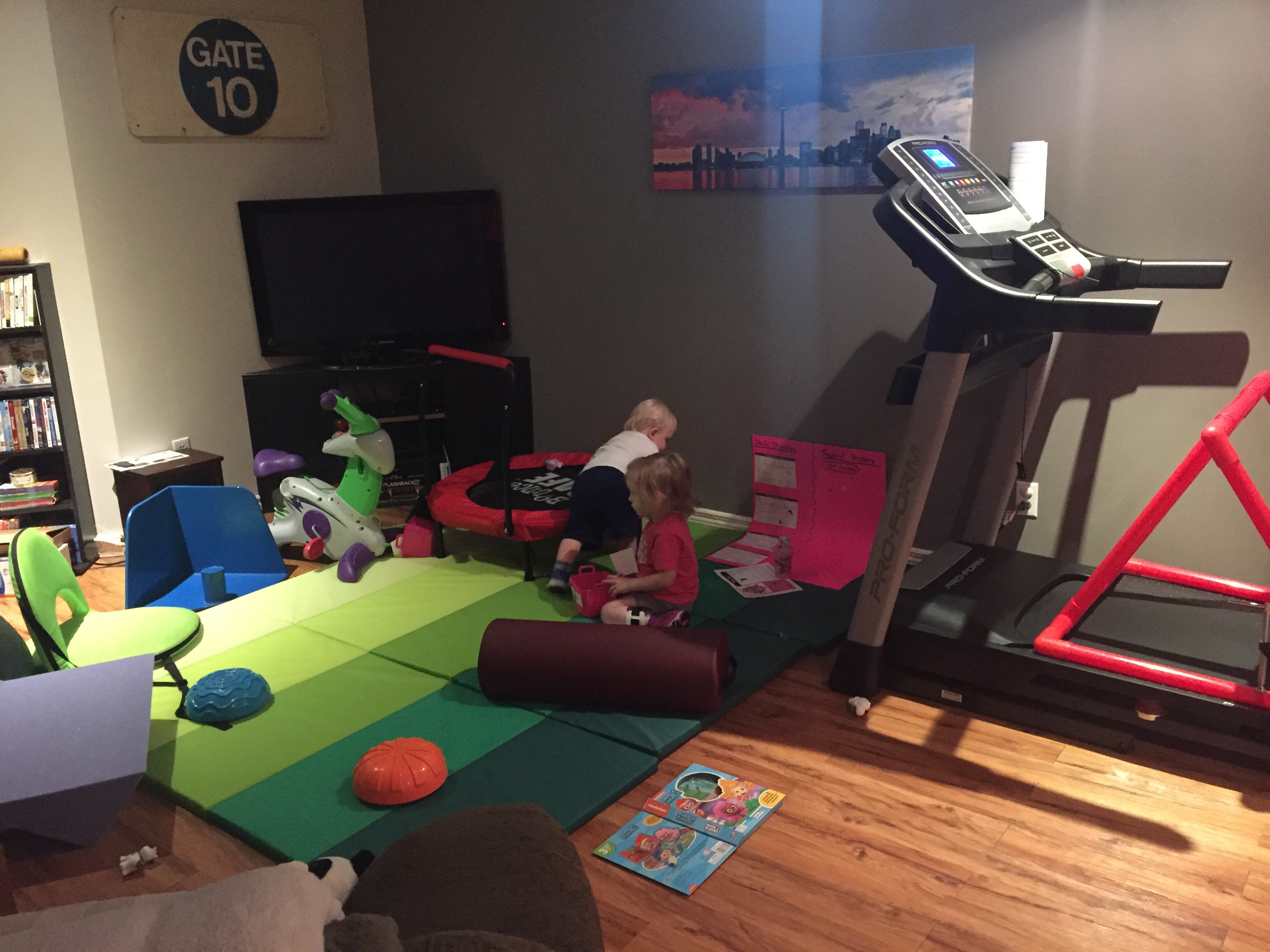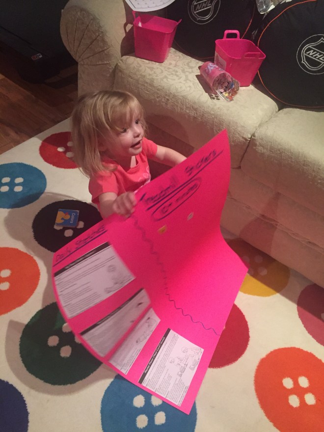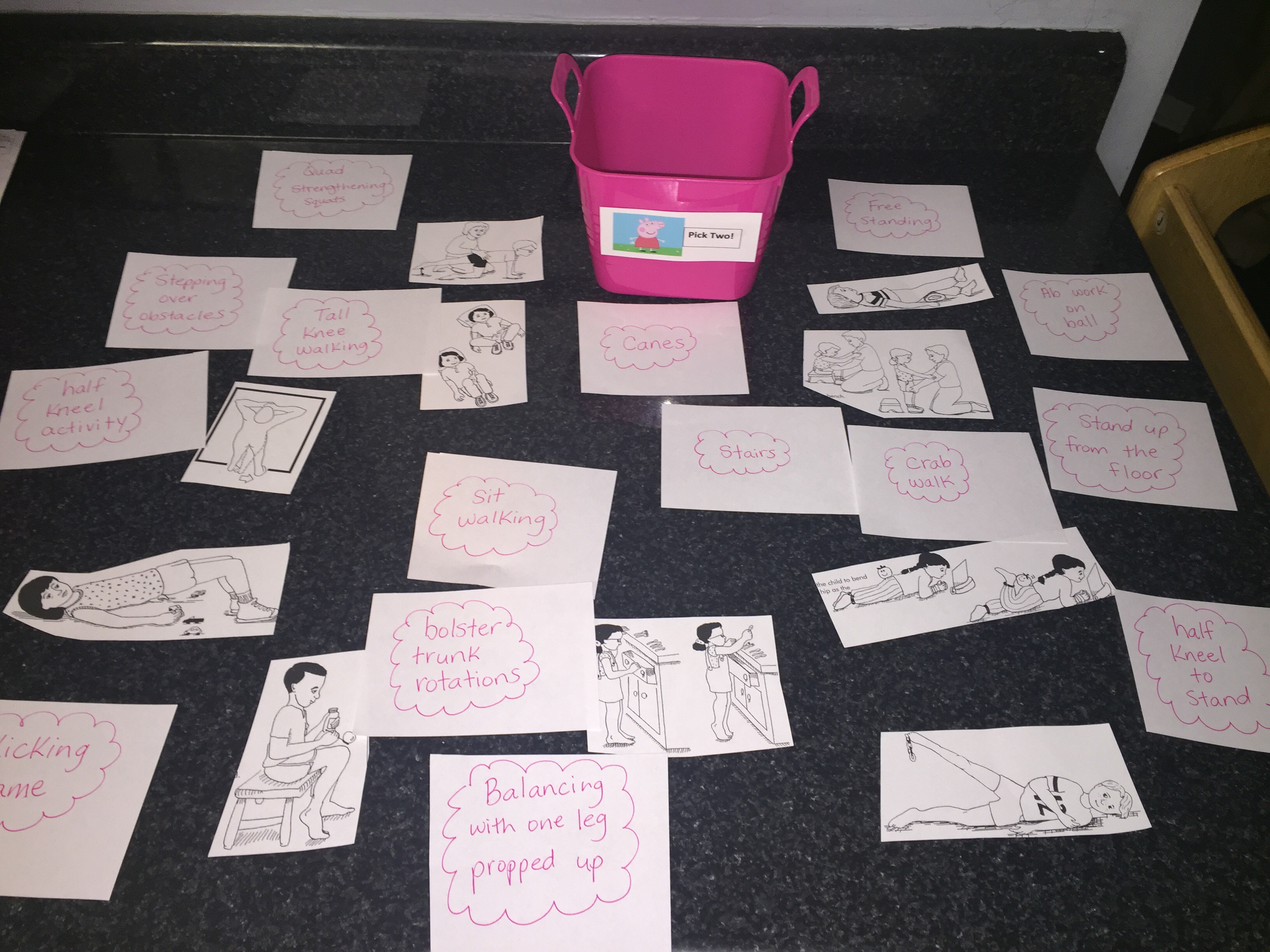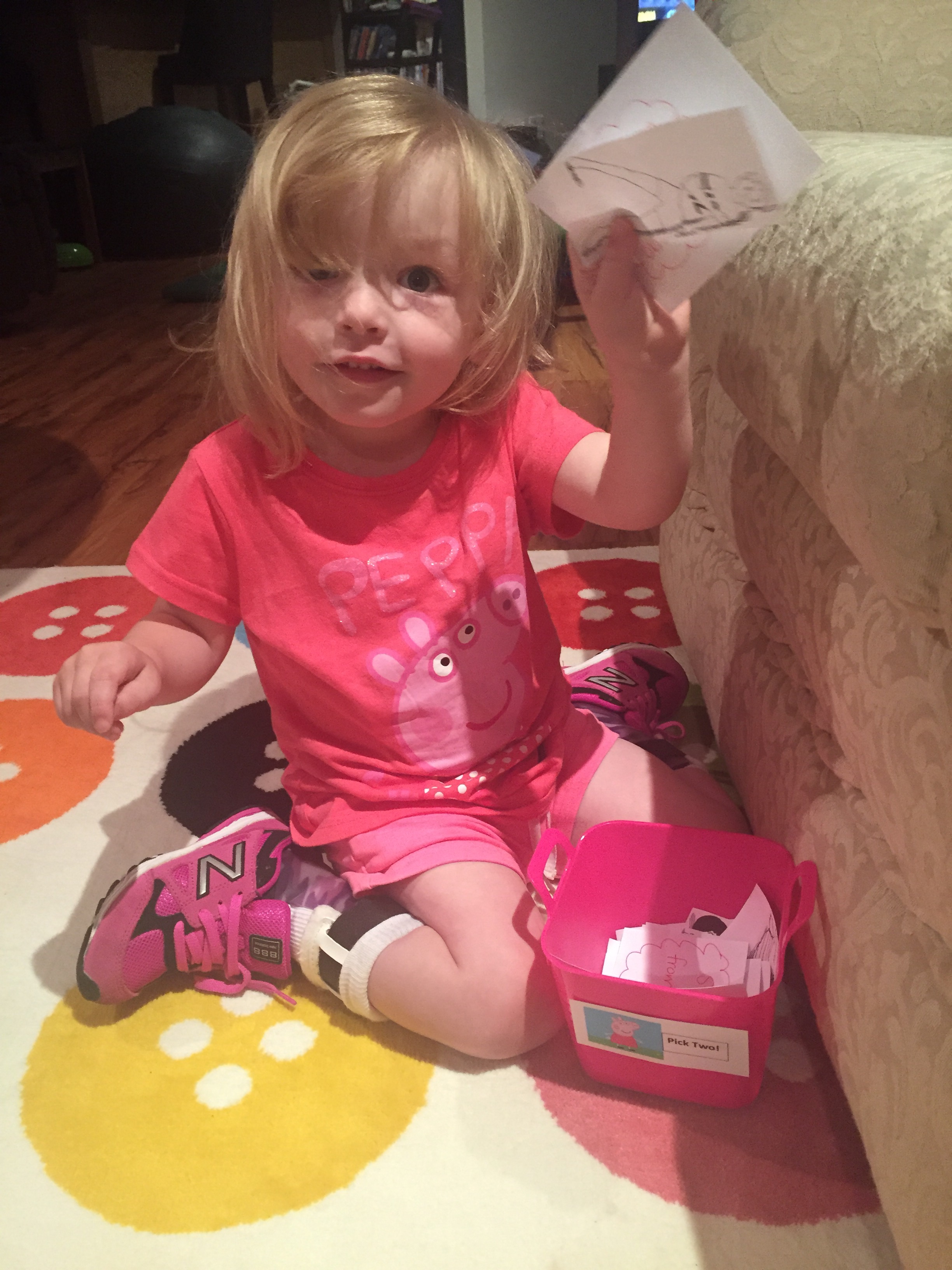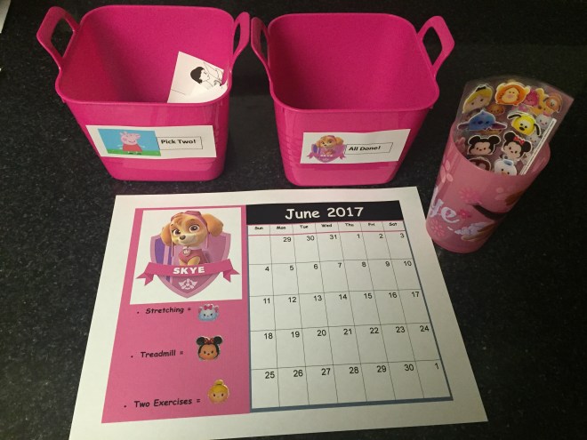 Madison will also pick two activities a day to do in her gym in the basement. She has a small bin with many activities to choose from. Once she picks from the Peppa bin and completes an activity, she will put it in the Skye “all done” bin to help us keep activities diverse throughout the week. She will cycle back through them once all have been completed in a weeks time.