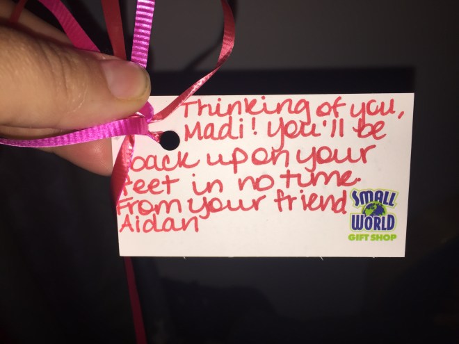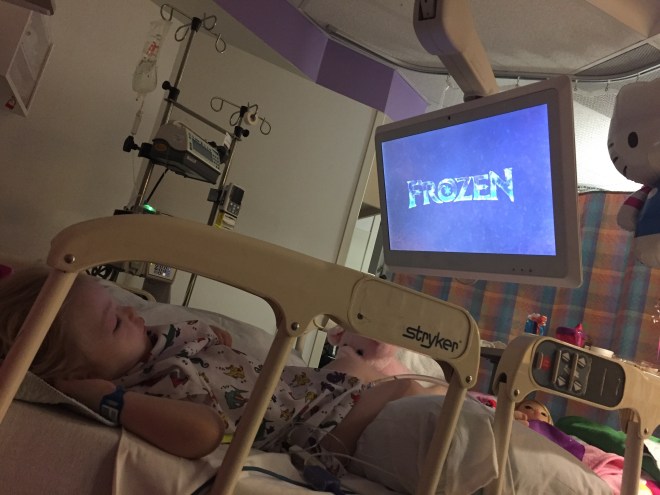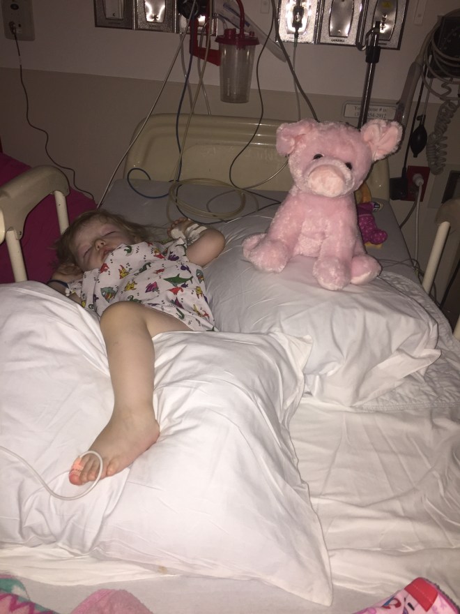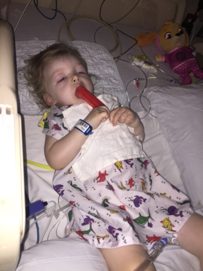 Madison slept most of the night and all morning. She woke up around lunch and ate a bagel and some apple juice. She is talking for the first time clearly and now knows she is in the hospital. She’s ok so far but asks to get up and go back to the hotel to play. She is itchy so she is on some meds to help with that. She snacked almost the whole day: crackers, bagels, gold fish, fruit, cookies, Popsicles, Cheerios and lots of apple juice. She is able to roll herself onto her side to prevent bed sores and is now in diapers as her plumbing has kicked back in early to everyone’s surprise. Thank you to Uncle Brian and Aunt Christina for her pink piggy! Thank you Aidan for the balloons!