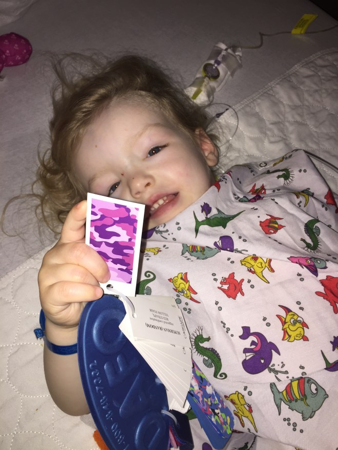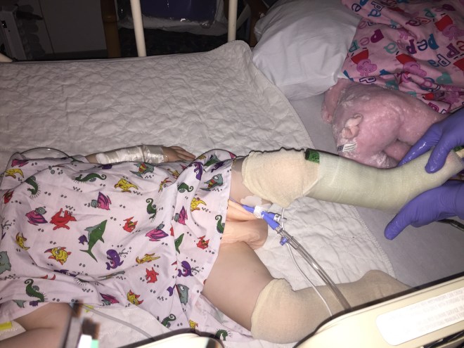Her day started with an early visit from neurosurgery and the pain management team to make sure she was comfortable and ready for a day on her back. Next, the hospitals orthotist visited to cast her legs for her new braces. She had to choose colours and patterns for two different pairs. She decided to go with the pink & purple camo print for her tall ones and bugs and butterfly’s for her short ones. She will be assessed by Dr Park & PT tomorrow to determine if she will need night braces for sleeping and serial casting next week.