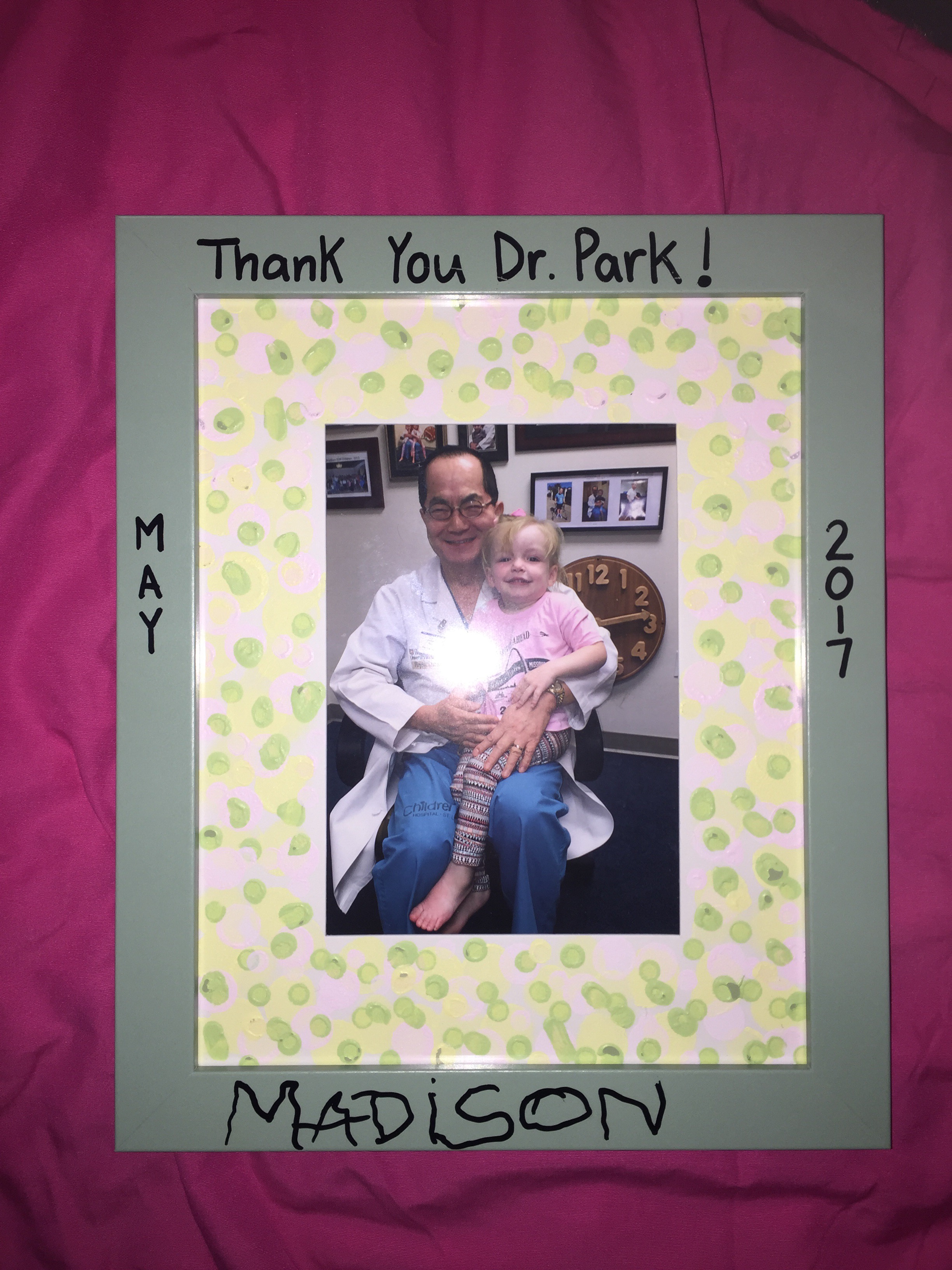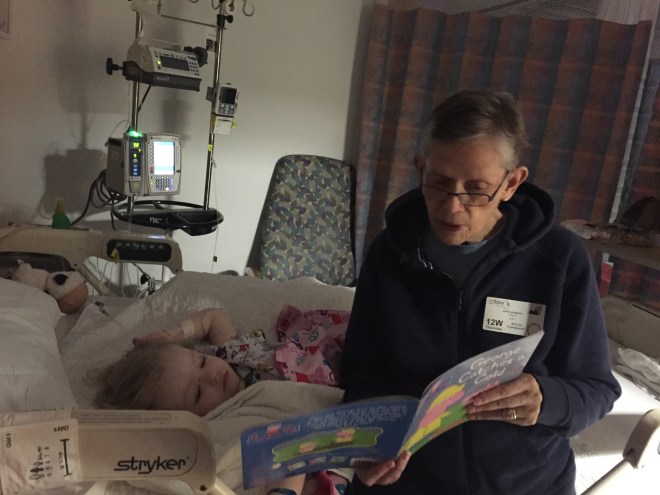 Madison’s exciting, last day on her back finished with a visit from Nana while Mommy went to eat and take a break. They read lots of books and went to bed at a decent time. Tomorrow is a big day – Madison will be able to get out of bed for the first time and she is excited to give Dr Park her frame she made him!