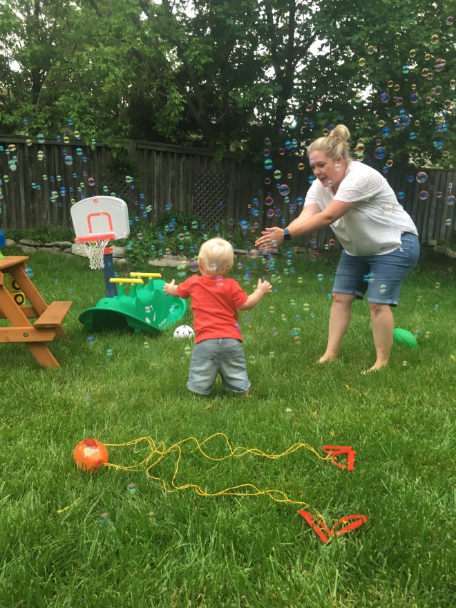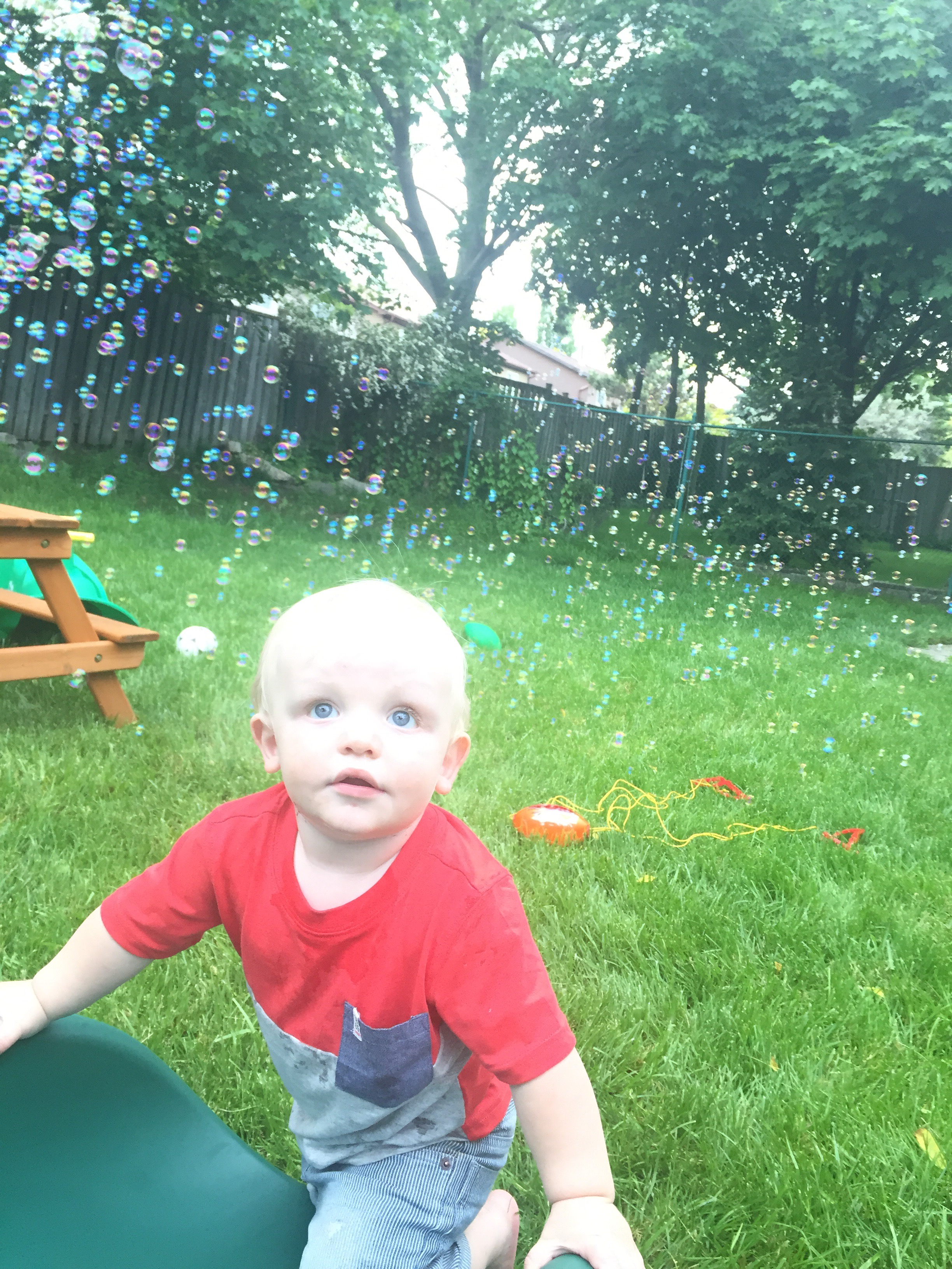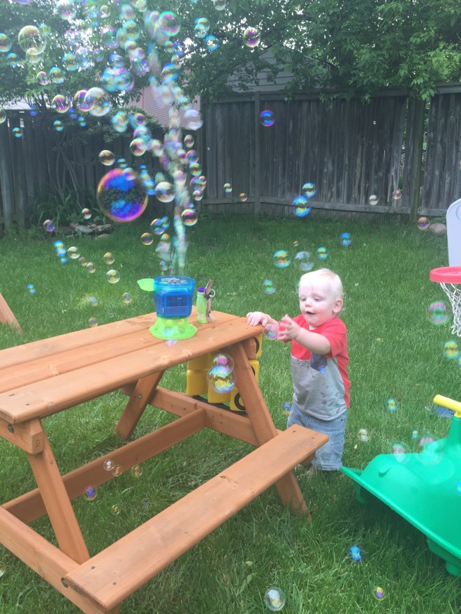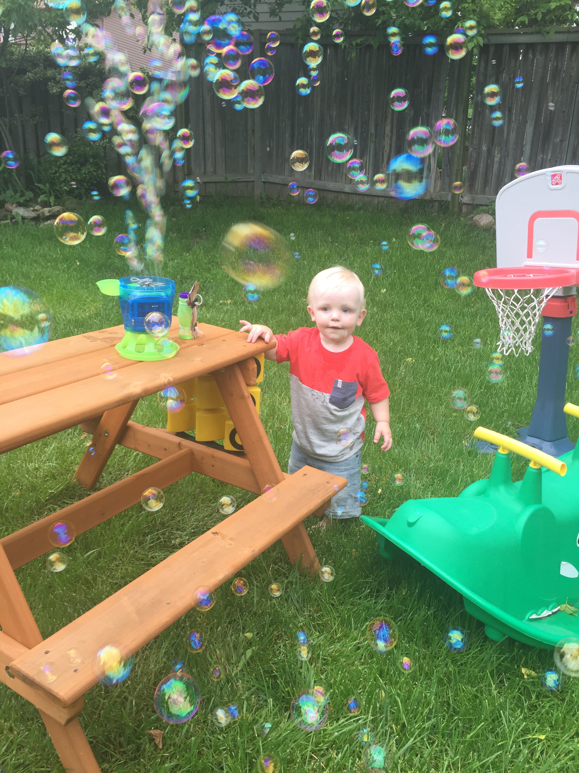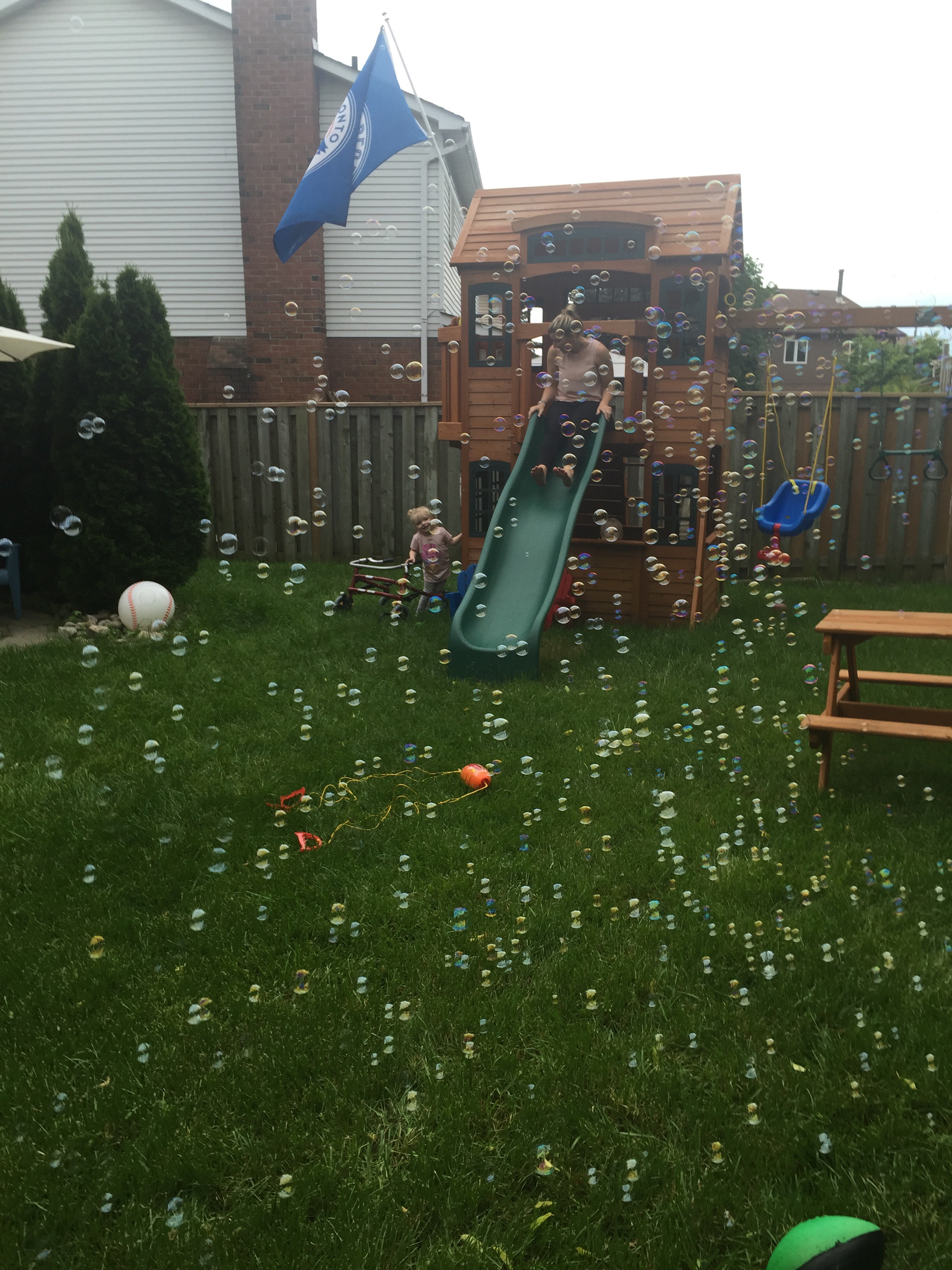 Once they were home Aunt Emily arrived to visit for the weekend. Madi was super excited to play in the backyard and check out her new bubble machine.