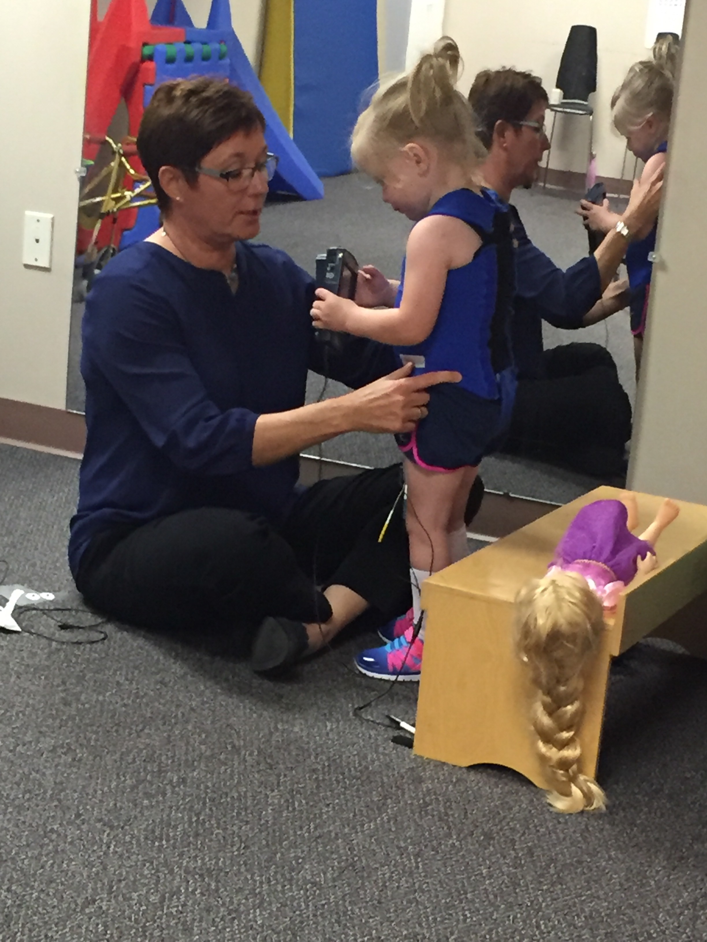 Madison had two sessions today. Two hours in the morning and one hour in the afternoon. The first part of the morning session was focused on Madi and Pia getting to know each other. Pia did some assessments and watched some videos of Madi before and after SDR. She reviewed our notes from St Louis and did a lot of video work with Madi observing her transitions, positioning and how she moves.