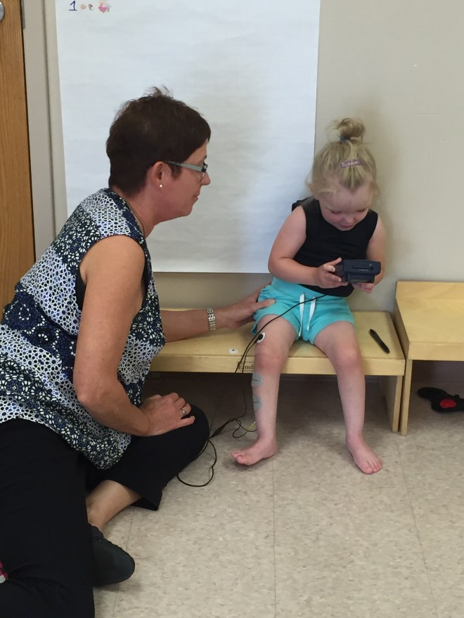 One of the muscle groups for functional movement that was worked on was for dorsiflexion as this is still a new movement and pathway for Madison as she wasn’t able to control dorsiflexion before her surgery. By using the bio feedback system, Madison was able to understand what muscles need to be used for what movement by a visual cue on the computer screen and a beeping sound as an audio cue. she was able to identify how to isolate specific muscles to achieve the movement she wanted. Madison was also fitted for a Spio compression vest that we will give a try to help her maintain good alignment to support her core and develop proper strength.