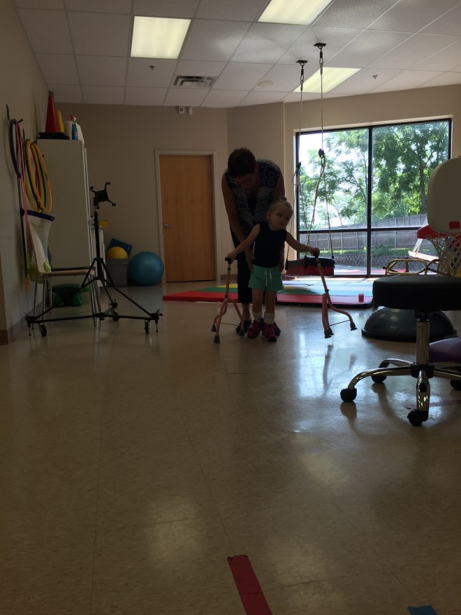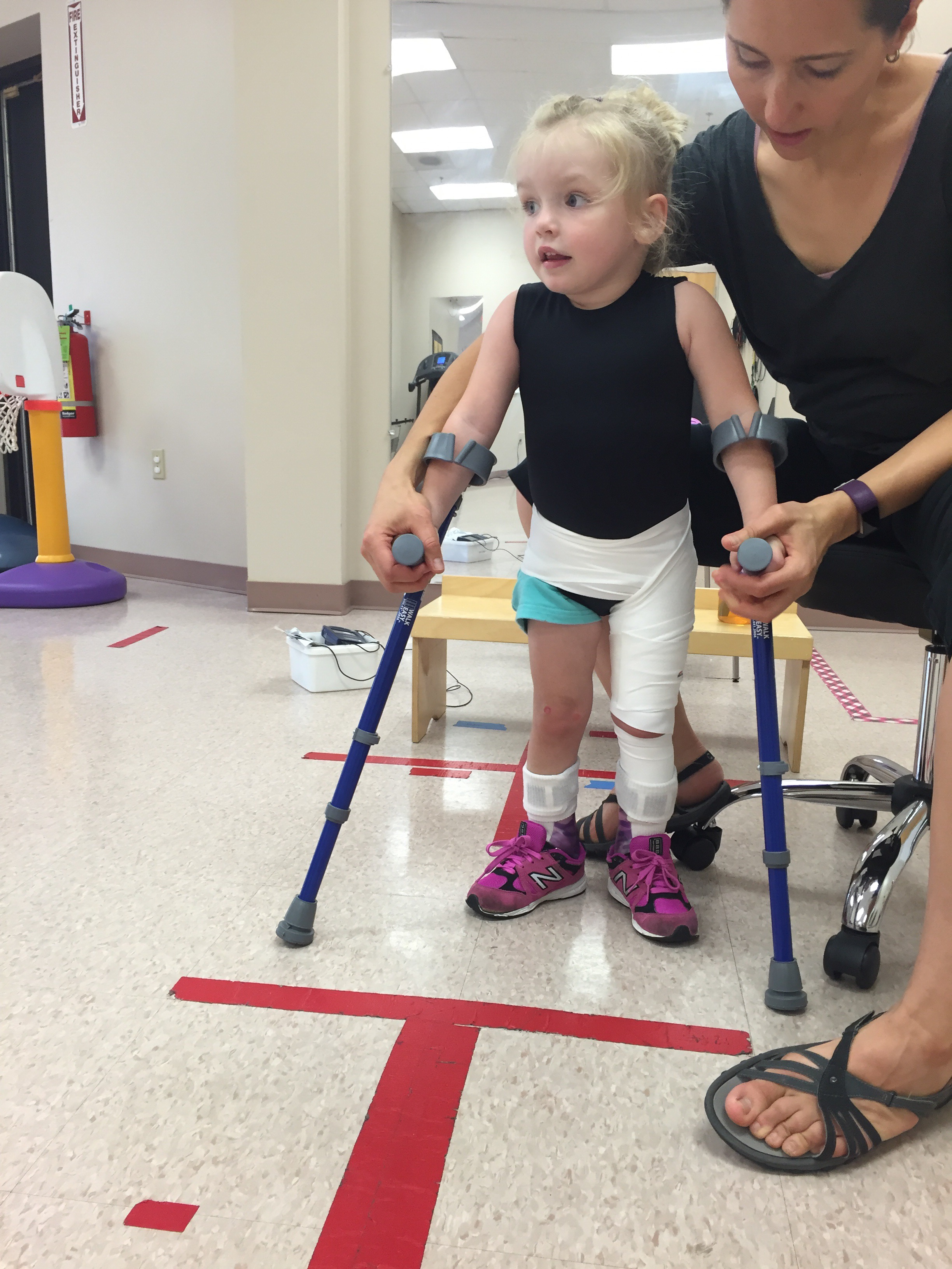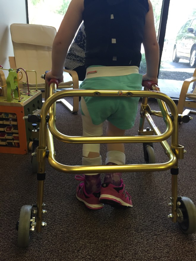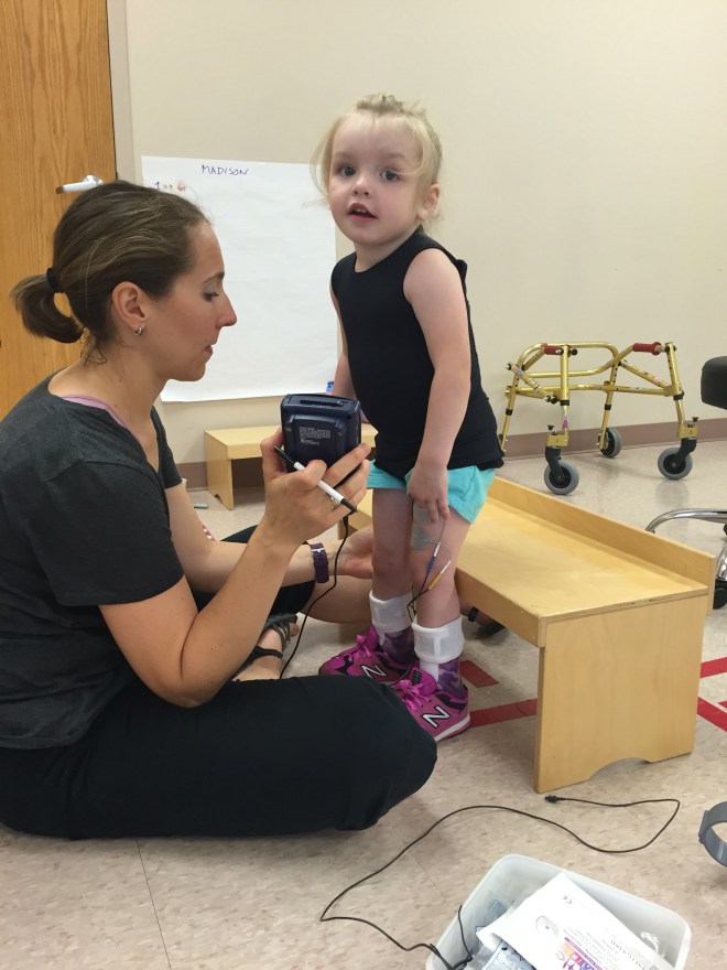 This afternoon she tried using forearm crutches for the first time. She also used single point canes. They were experimenting with less support to see what would happen. It was super challenging for Madison to coordinate, but her gait significantly looked better.