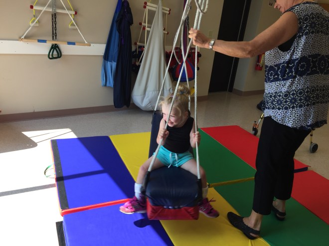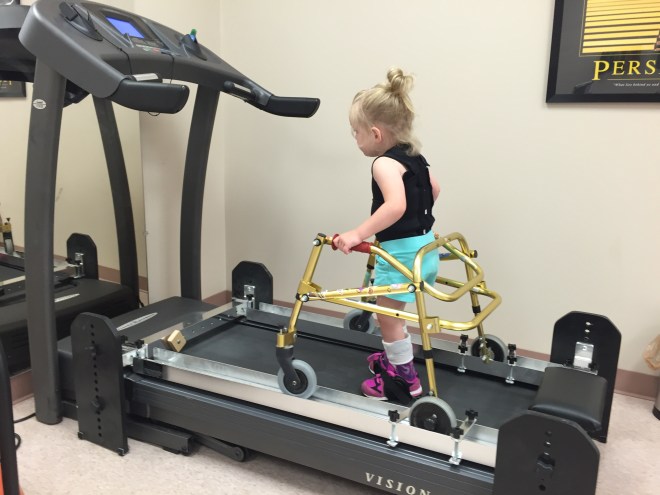 Madison worked on some walking in her walker on the treadmill today as well. She wore squeakers on the bottom of her shoes so she could hear every time she made a heel strike. She also walked to the beat of music to help create a natural flow with her walking. She then got off the treadmill and walked around the hallway to try and keep the same beat even though the music wasn’t there.