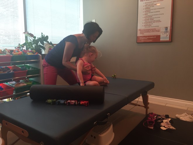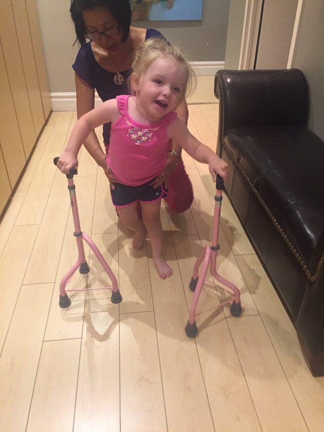 Madi had a good ABM session with Judy this morning. They worked a lot on transitions from side sitting and creating more movement and rotation in her trunk and ankles. Madi also did a great job walking in her tripod canes with no braces on.
