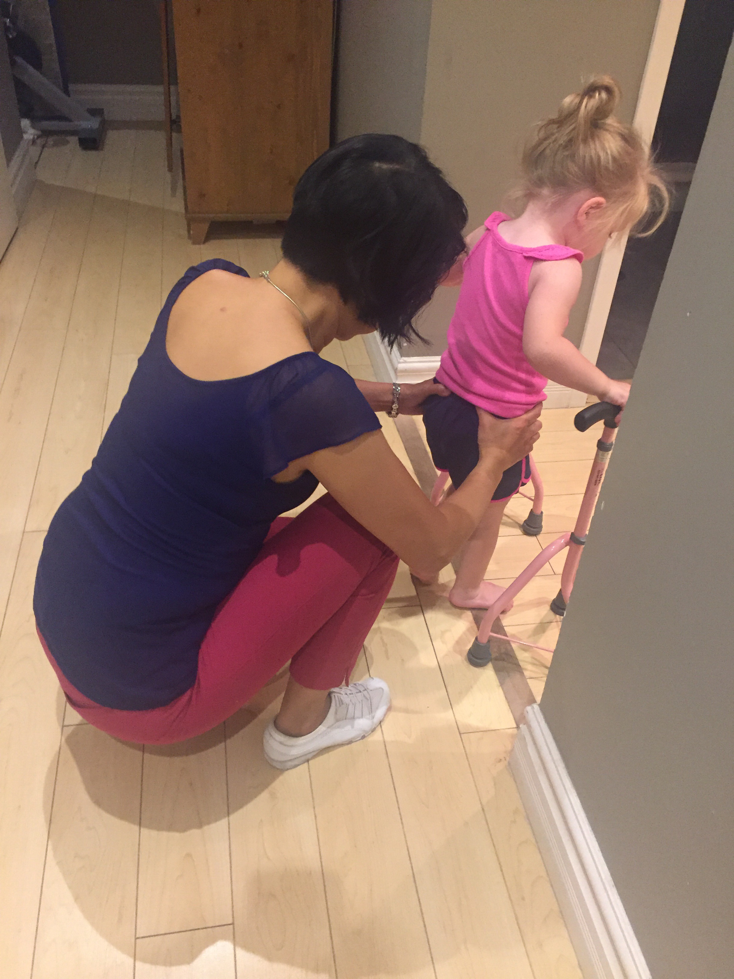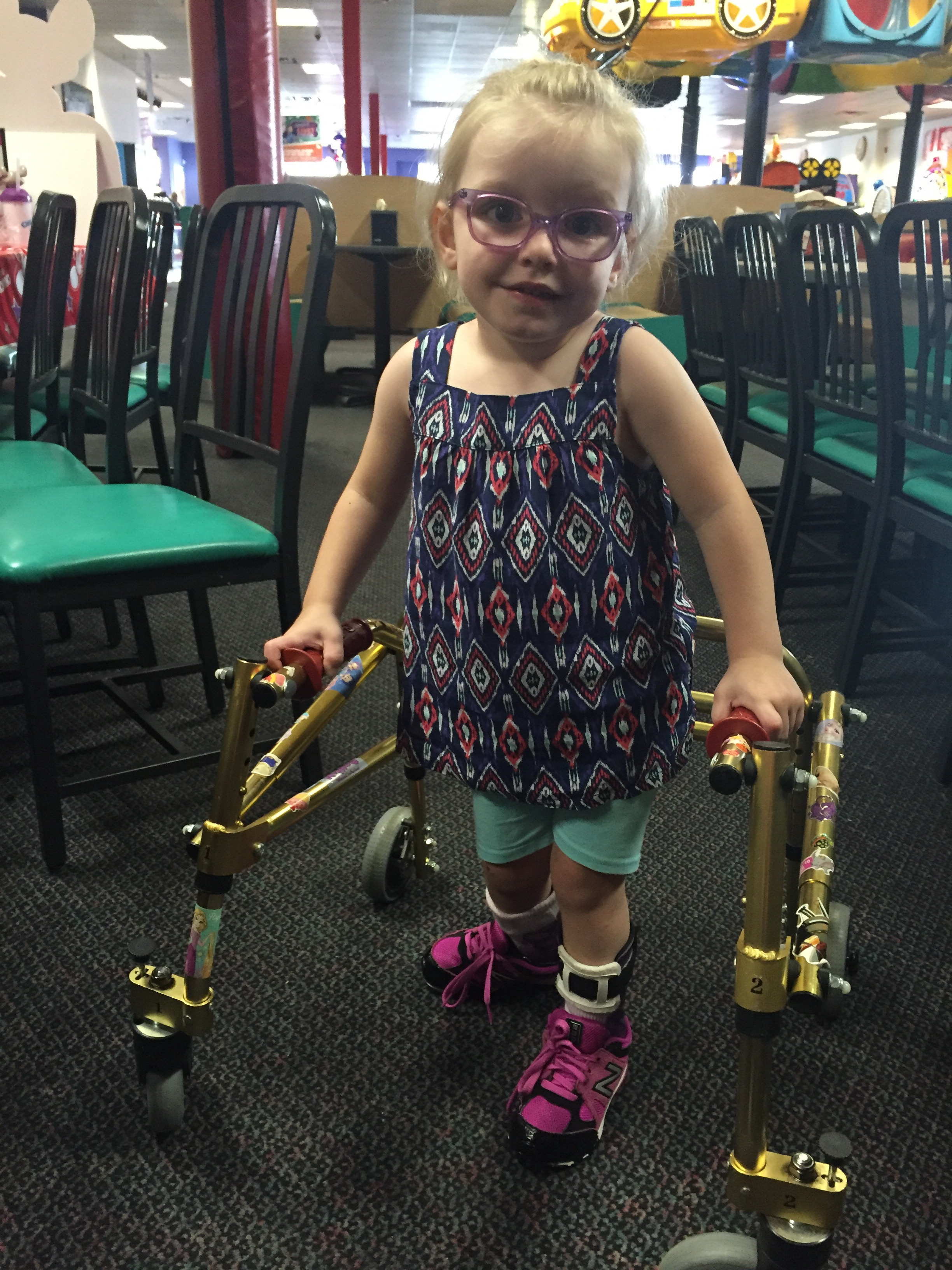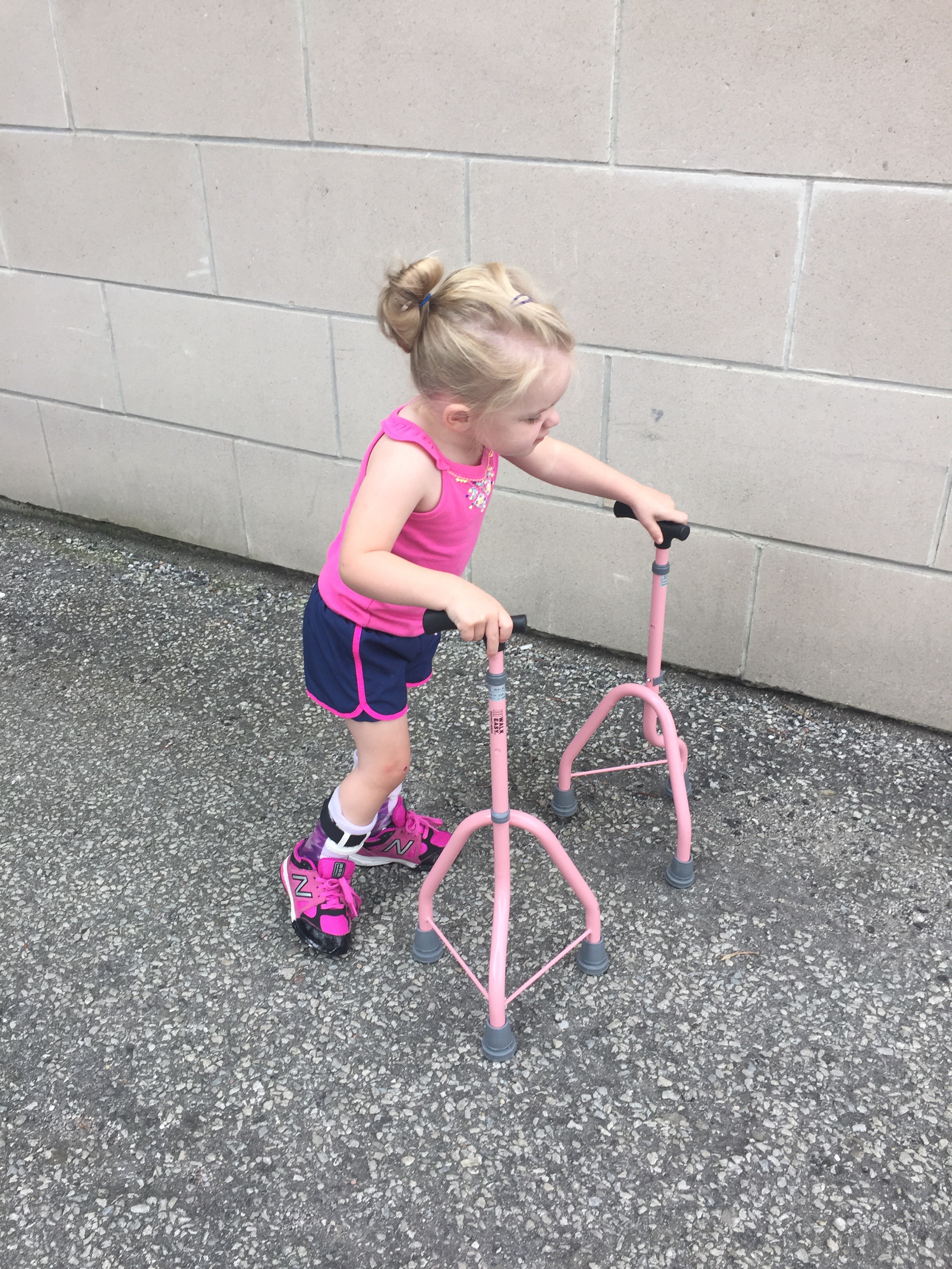 Madi had a good ABM session with Judy this morning. They worked a lot on transitions from side sitting and creating more movement and rotation in her trunk and ankles. Madi also did a great job walking in her tripod canes with no braces on.