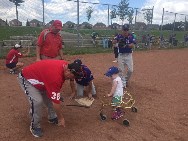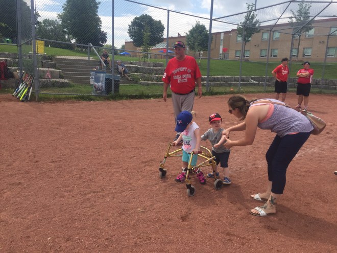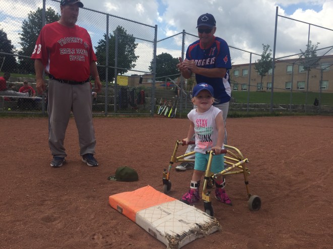 What a wonderful day of softball! Madi was at the Markham Classic softball tournament today put on by SPN Ontario and Malcolm Murchie. This years funds are being donated to “Madi Moves” to help Madi and her friends with rehab costs from their SDR surgeries in St Louis. Madi thanked the teams and took some photos before running the bases. She also was in charge of the coin toss for the last game of the day. A big thank you to Malcolm, SPN Ontario and all the teams who participated and donated!