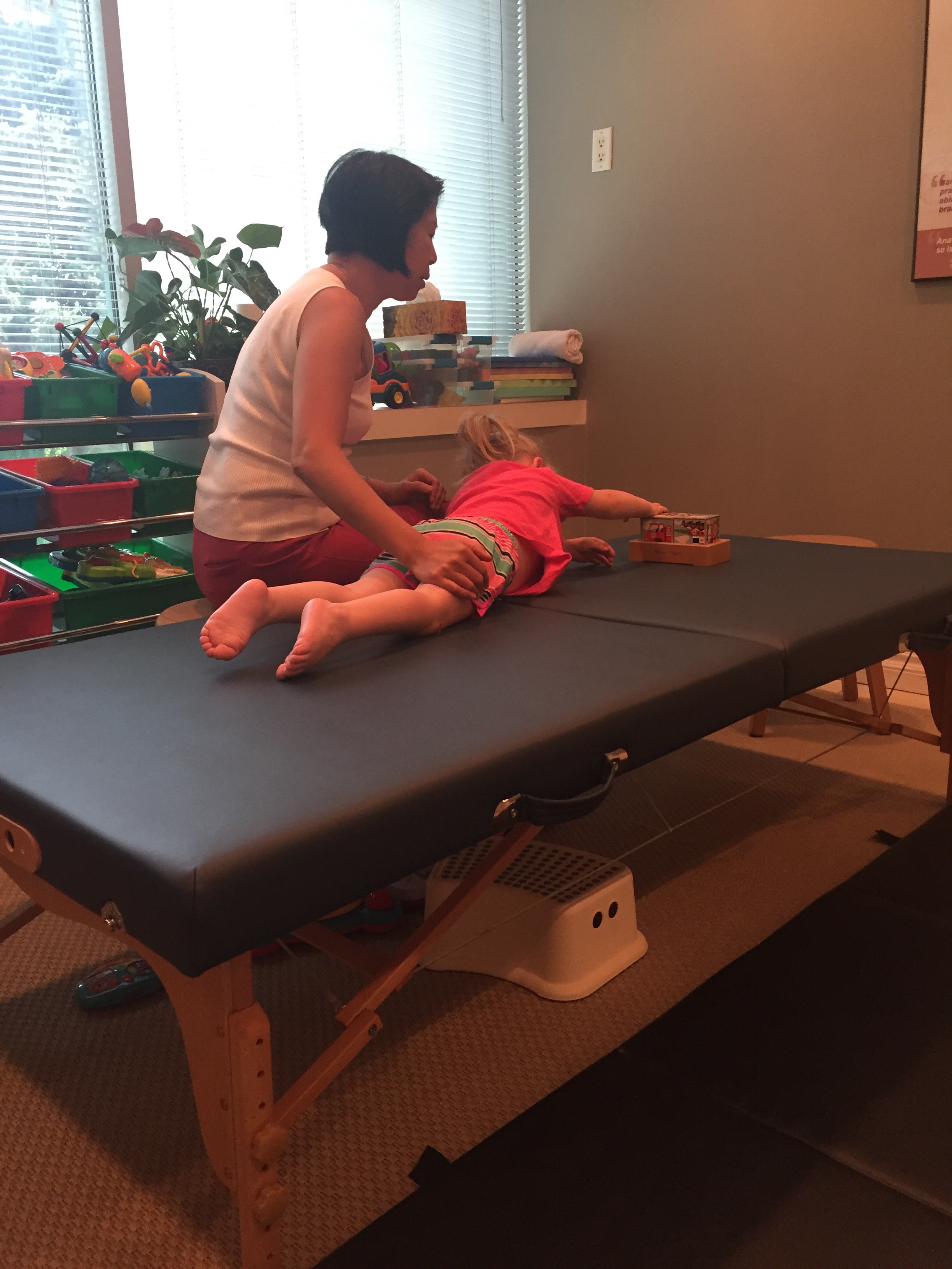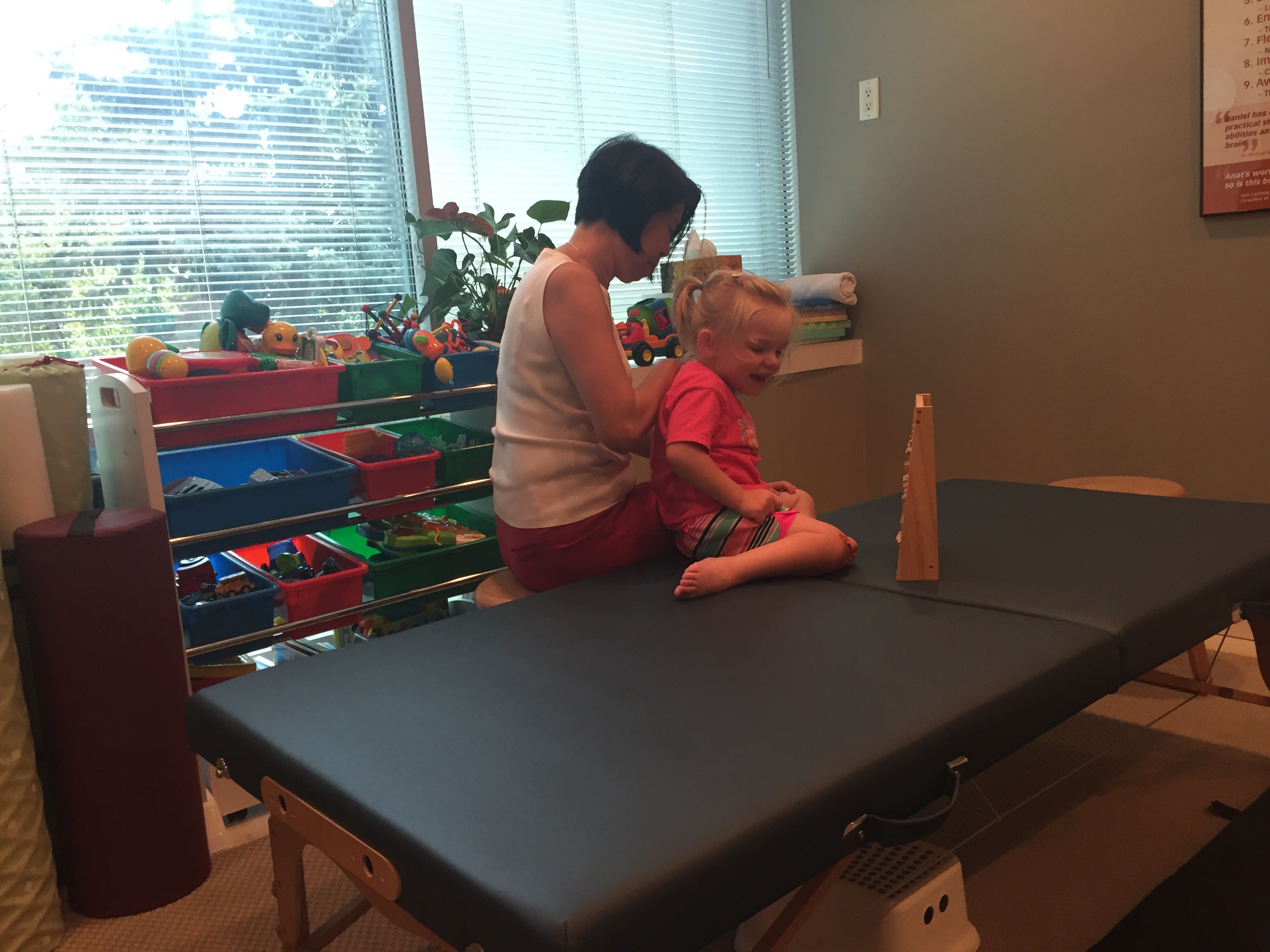 After some down time she headed to Judy’s for an ABM session. They worked on floor transitions, increasing her trunk rotation, range in her hips and flat feet on the floor when walking barefoot.