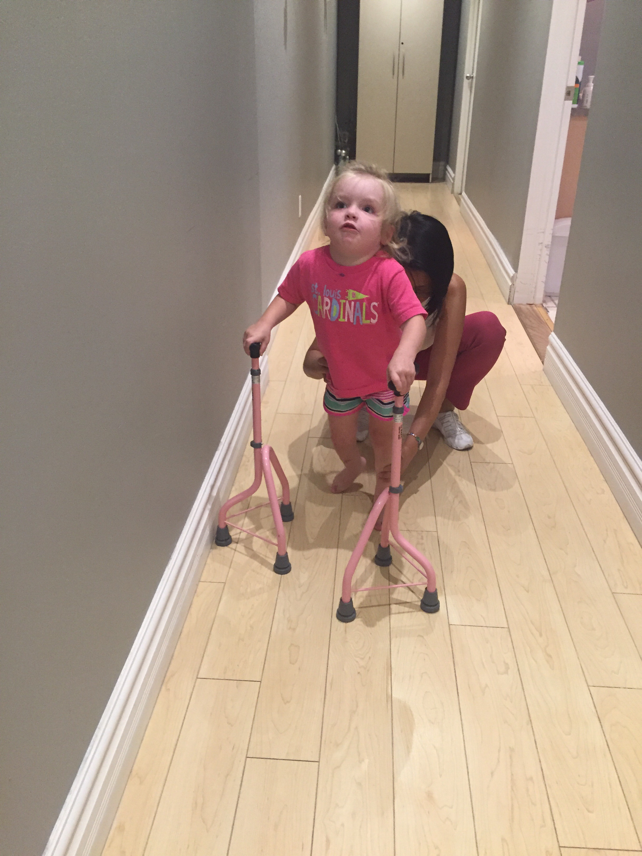 Madi was thrilled to be back at camp today. She loved their water play outside and did a great job with her walking.