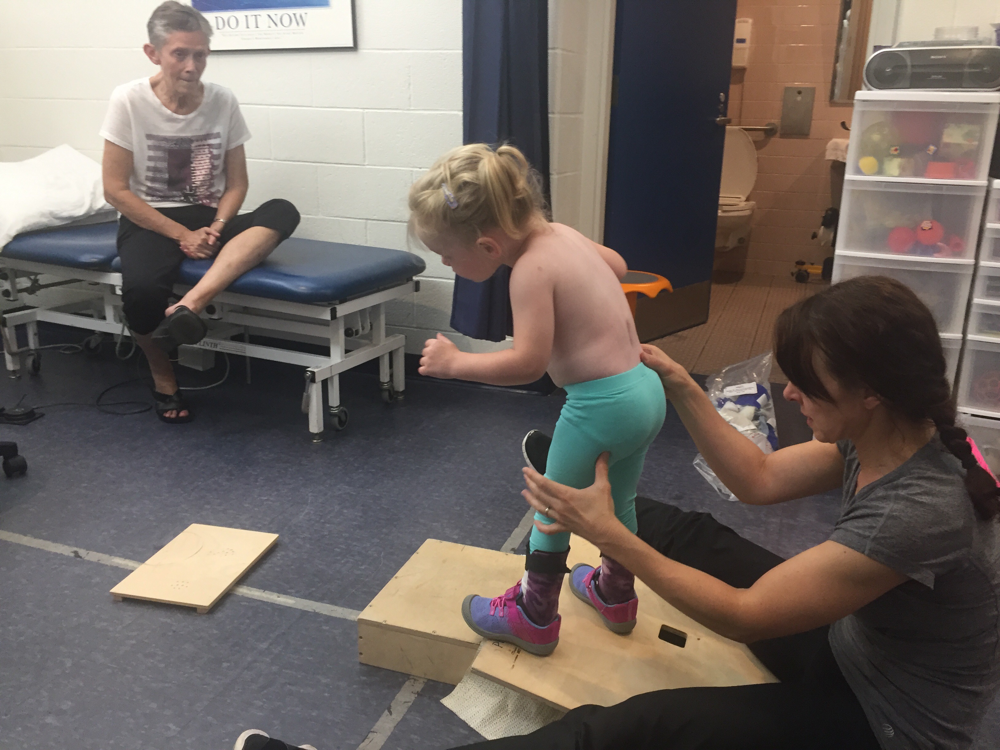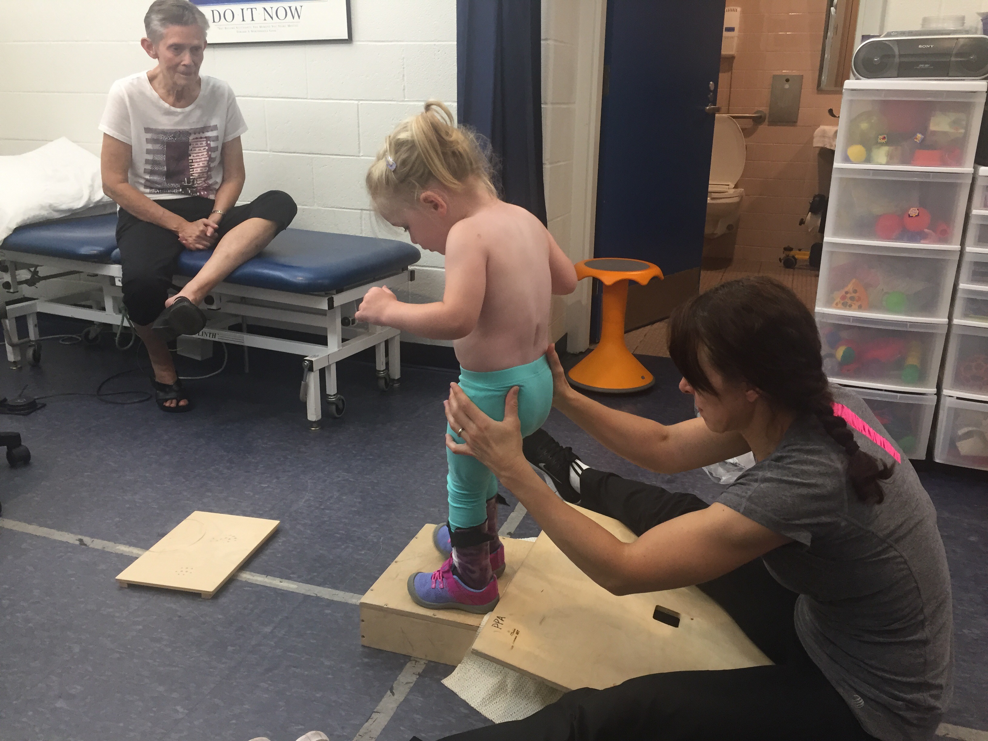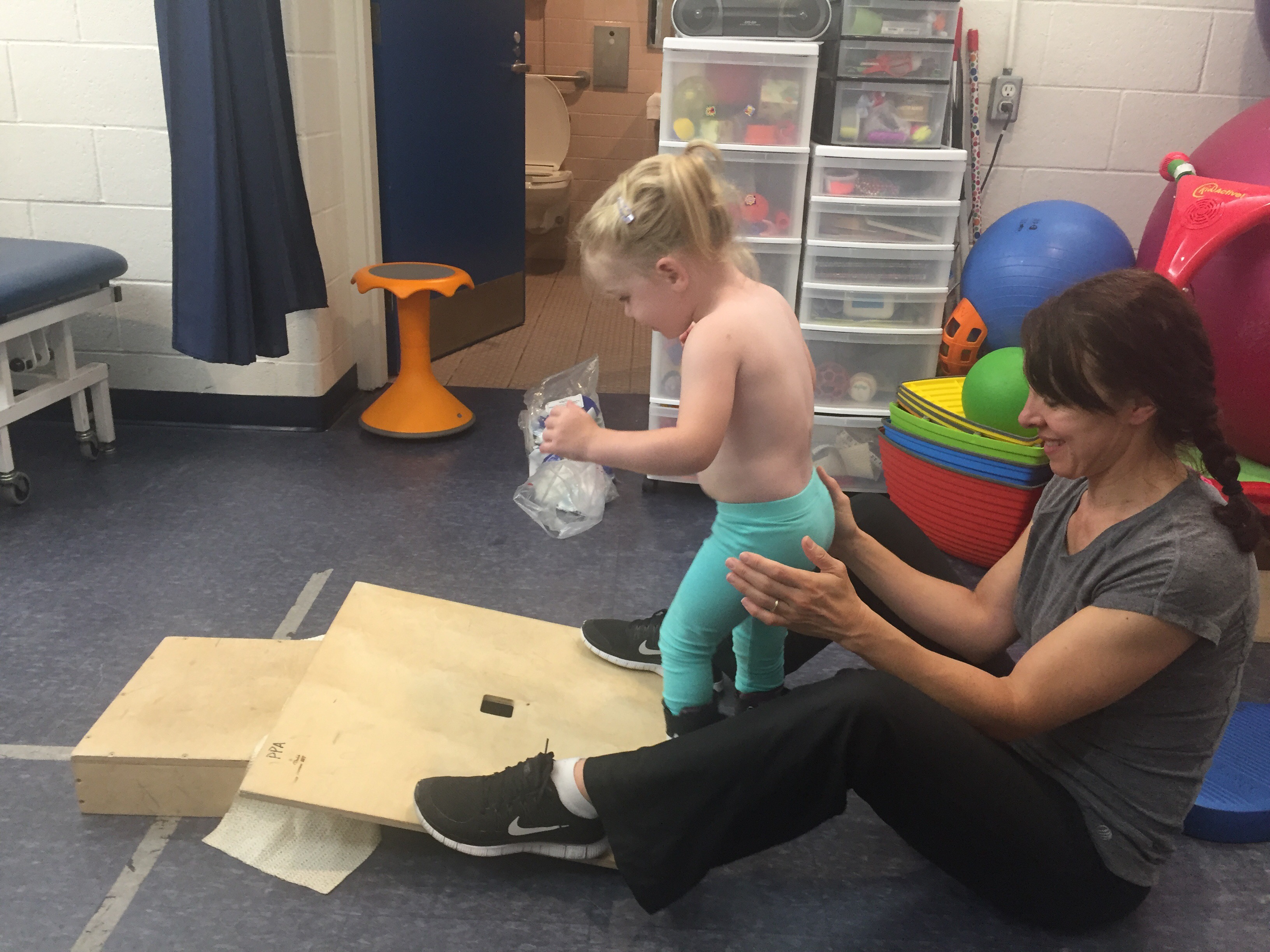After school, Nana & Madi headed to physio with Stephanie. Her teachers said she was very tired at school and she slept in Nana’s car the whole drive to physio, so we weren’t sure how productive the session would be – But when she started working with Stephanie she did great! Lots of walking, doing two handed activities while doing independent standing and blowing noise makers to practice breath control when moving. She is also doing a great job stepping up and down with objects on the floor.
