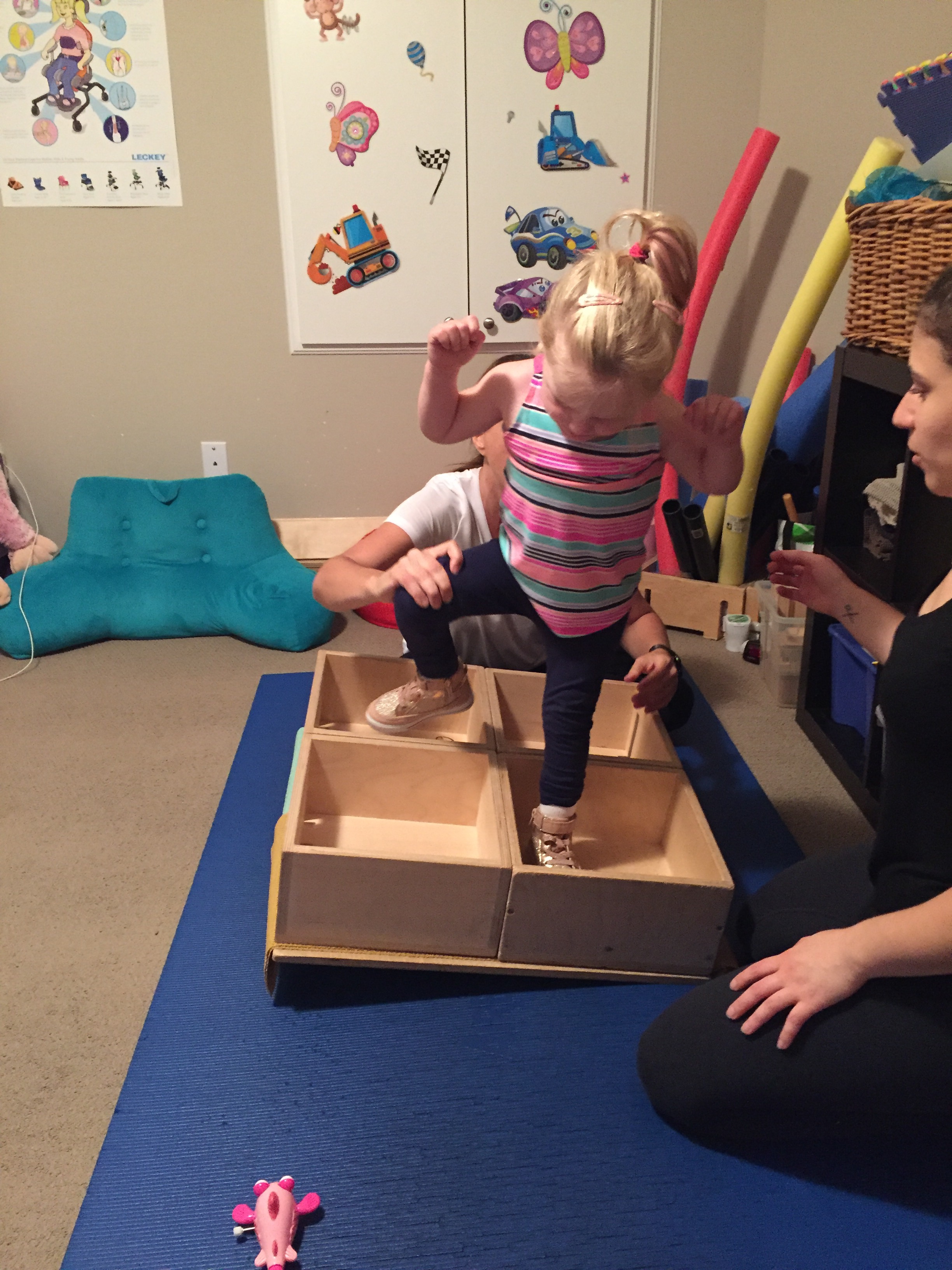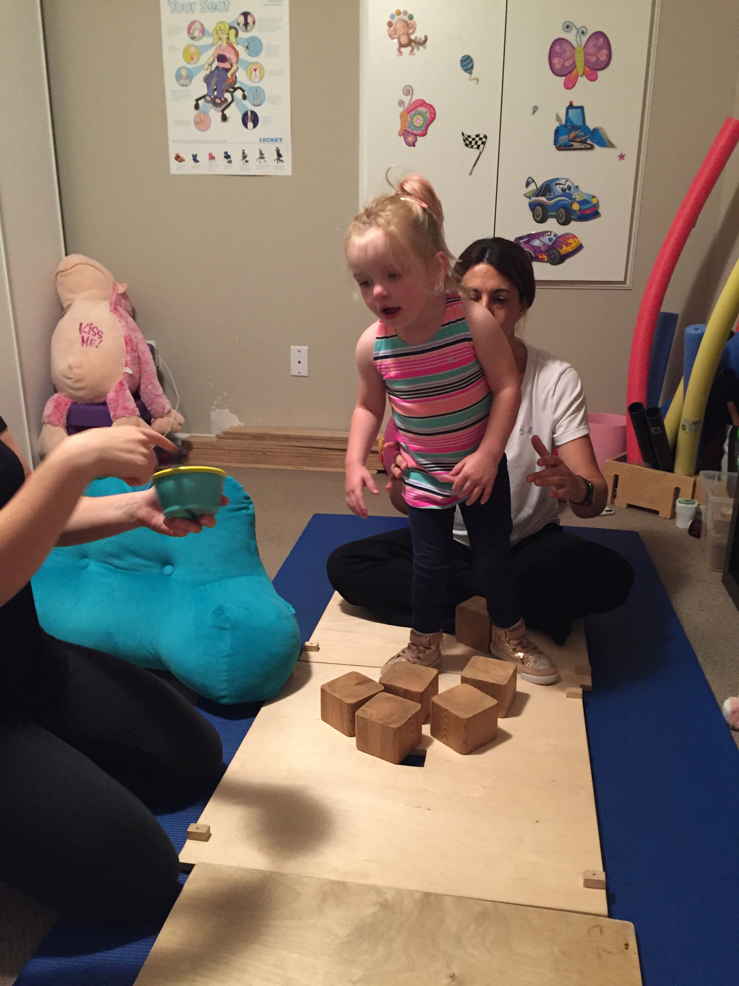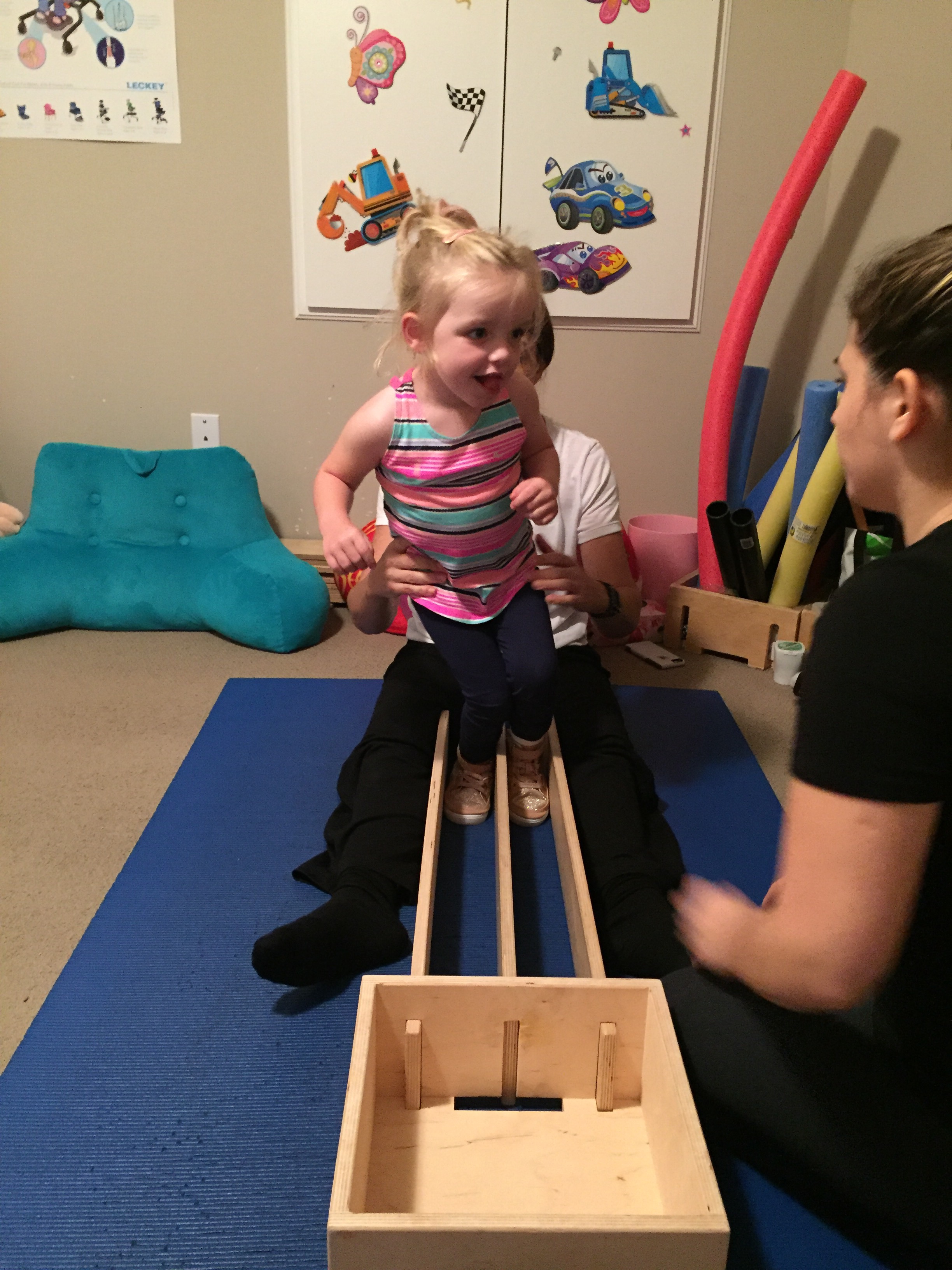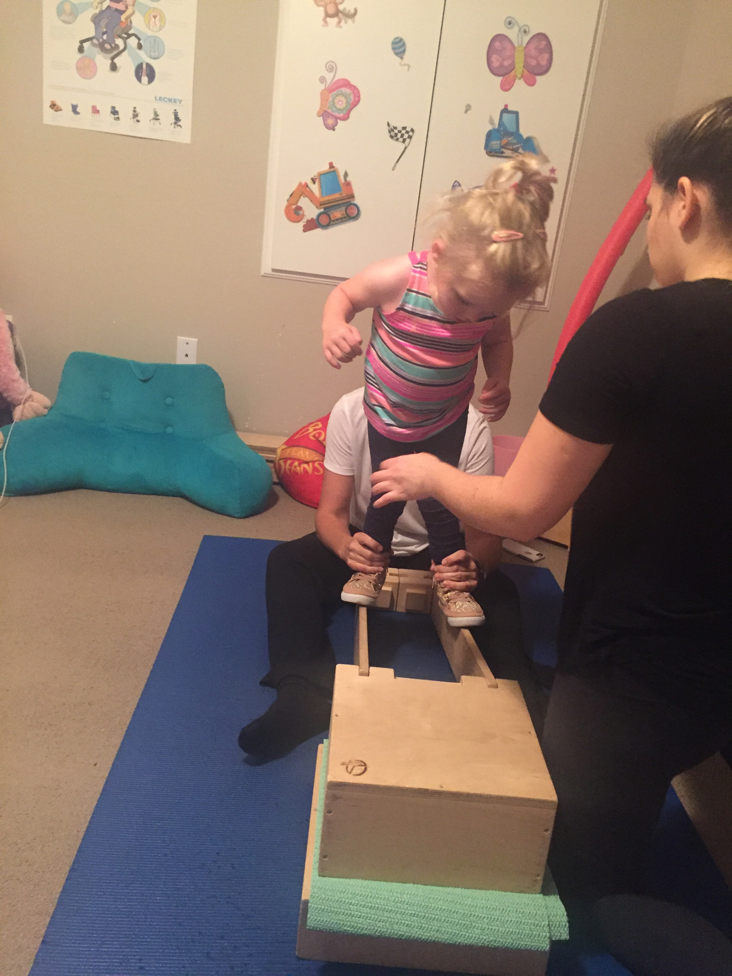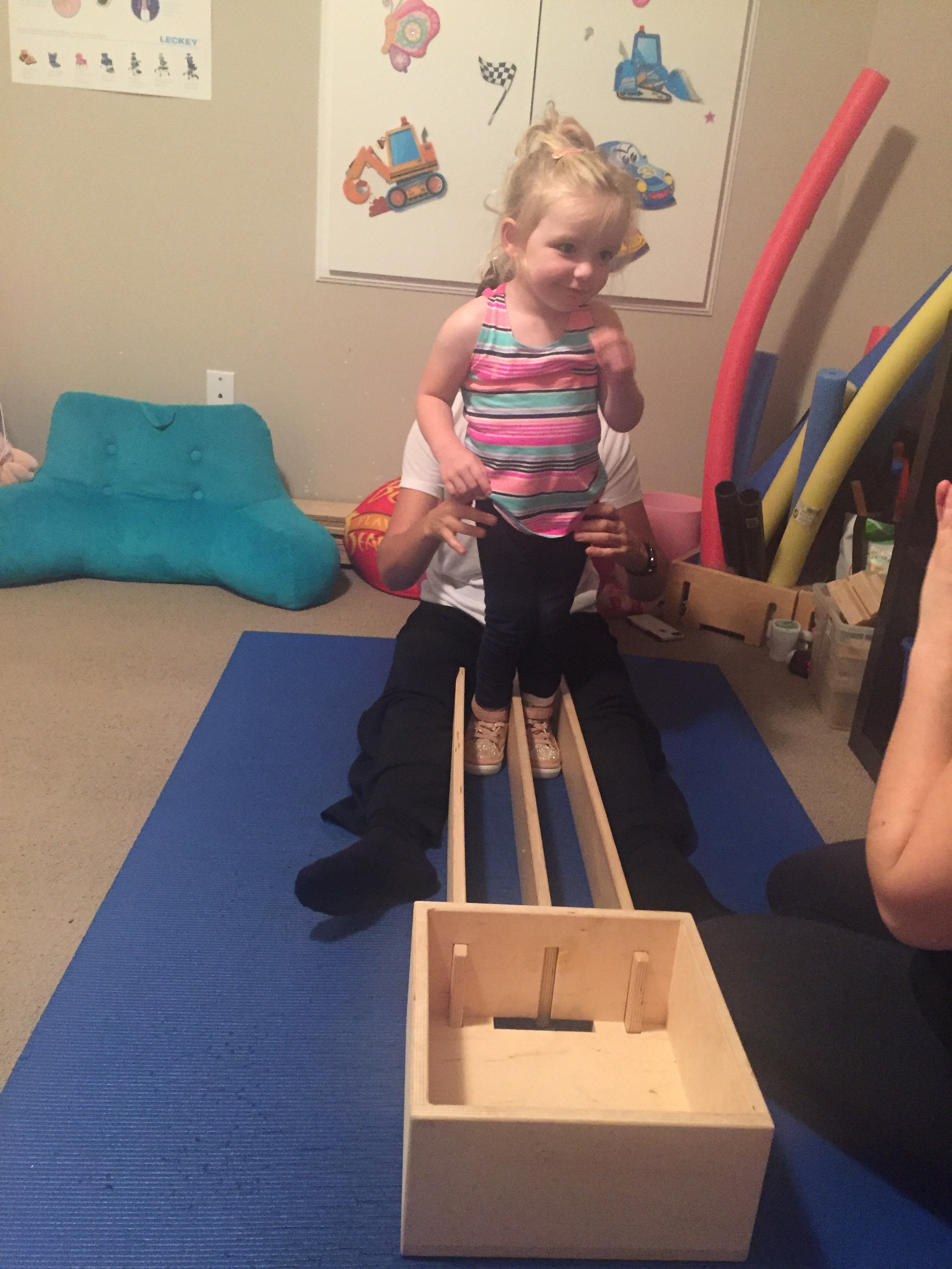 After a snack and a break, Madi headed to see Jo-Anne. A new exercise they did today was trying to walk between narrow pieces of wood. This helps her develop a narrower walking pattern with more emphasis on the forward motion of the step to avoid the side to side stepping.