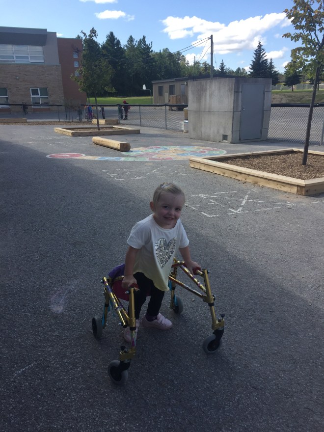Madison had her first school picture day today. She was pretty excited. She wore a pink tunic shirt and jeans with her favourite pink sparkle hair clips. She was also excited for school because it was library day. They read a book as a class and she did her book selection for the week: A Lalaloopsy book. She ate lunch with her friend Nora, played outside with Marcus and used her canes in the classroom for most of the day.