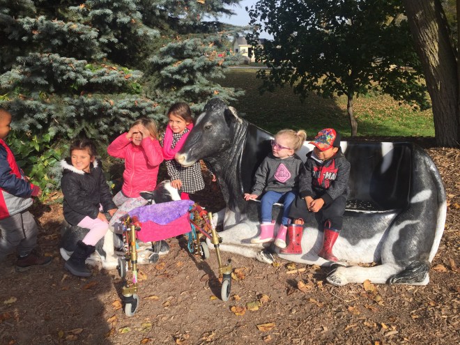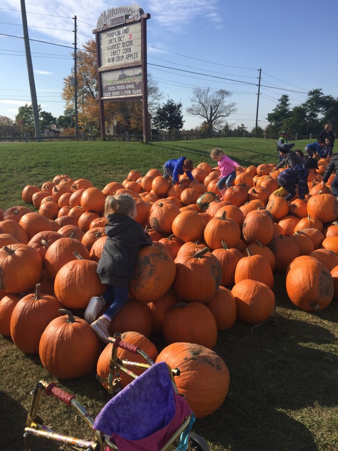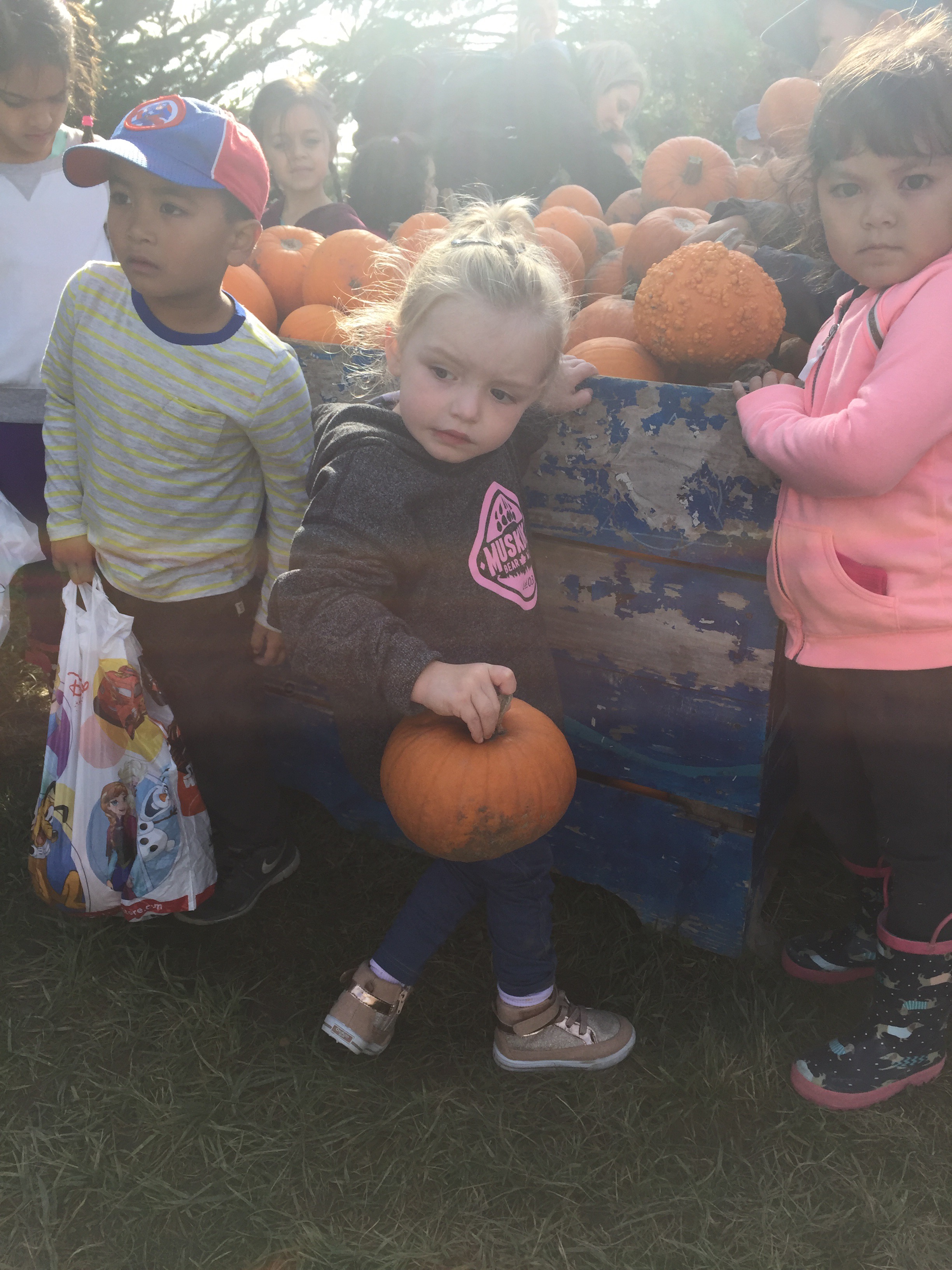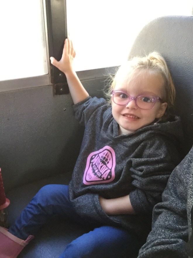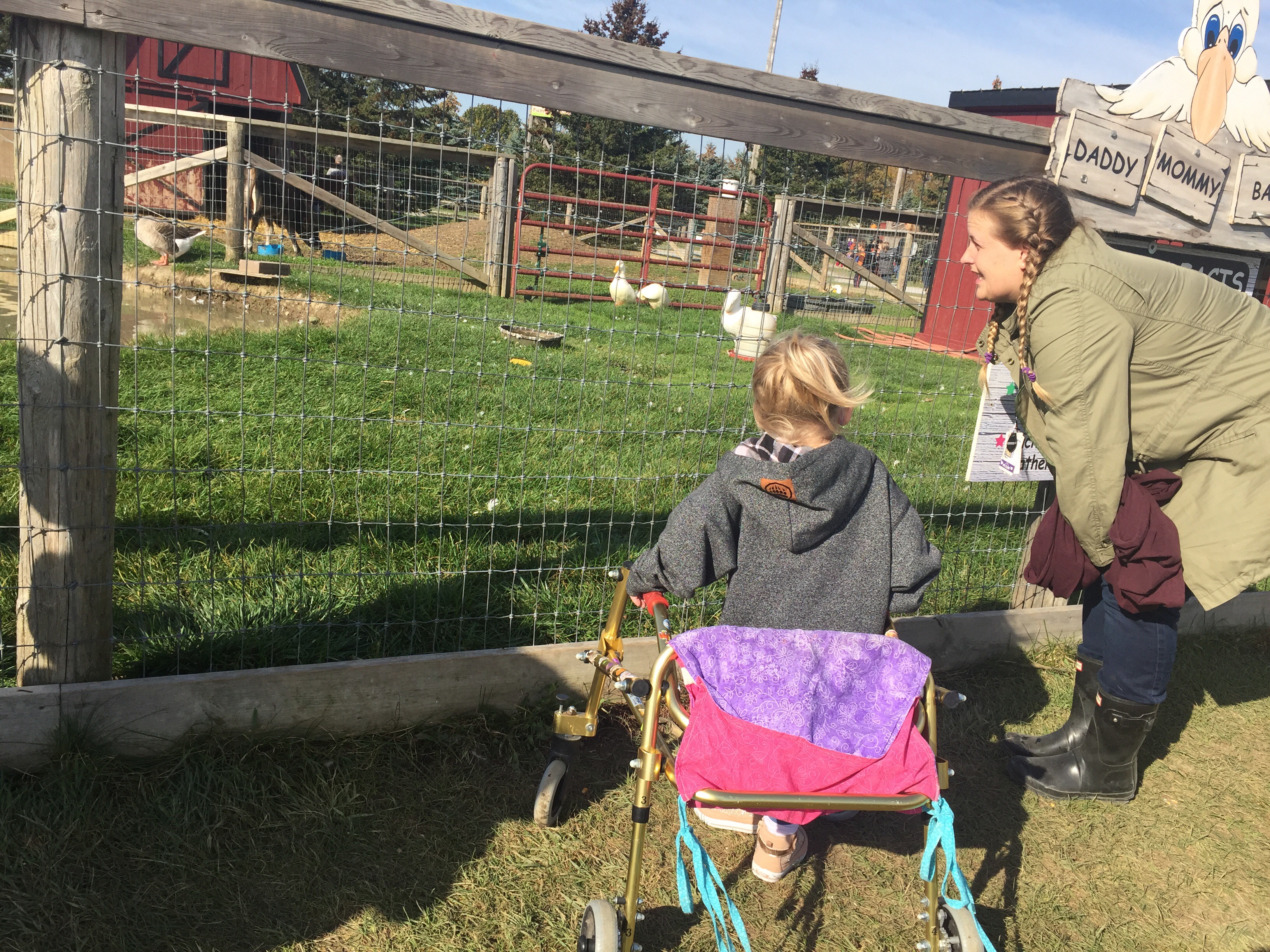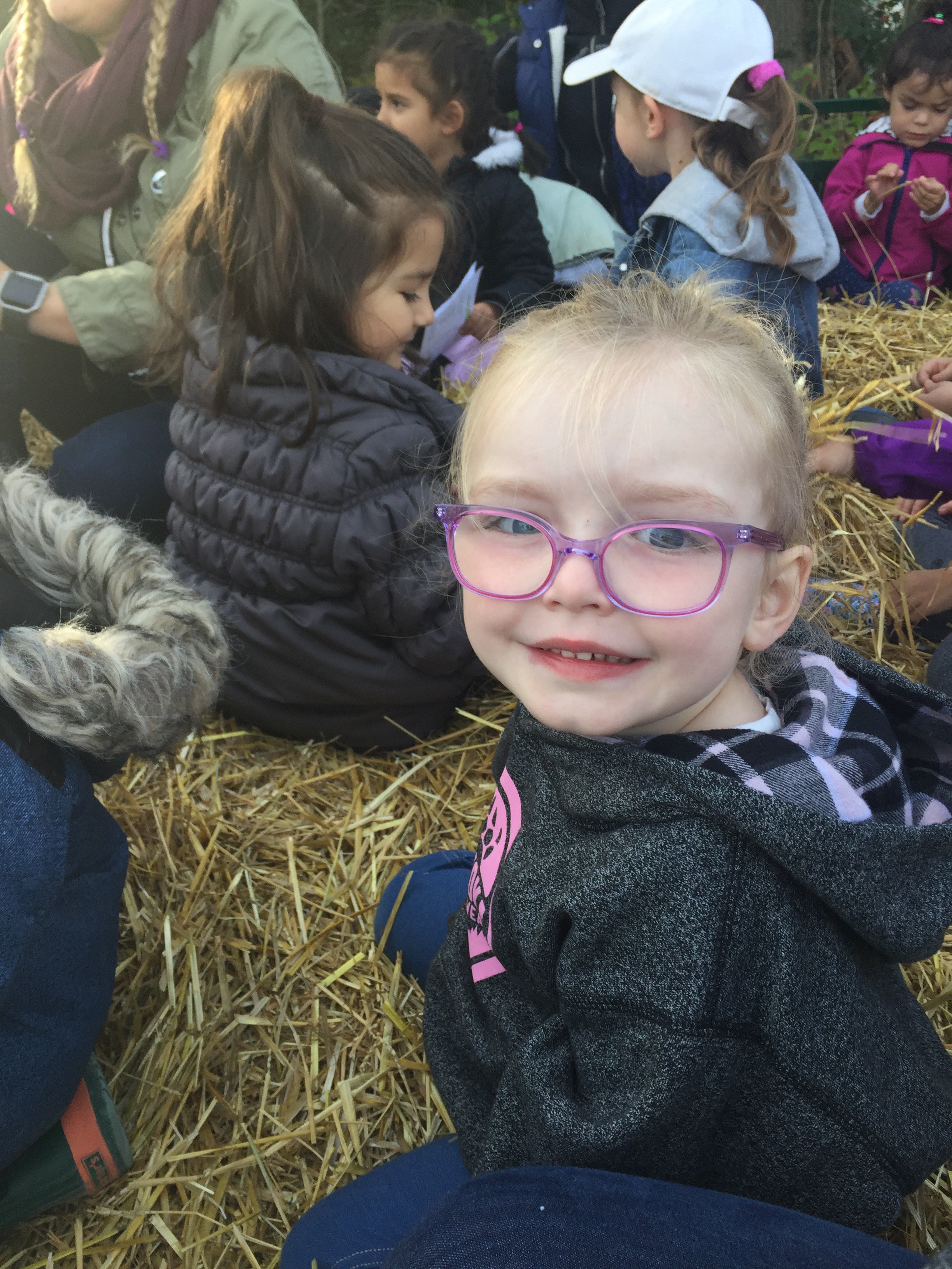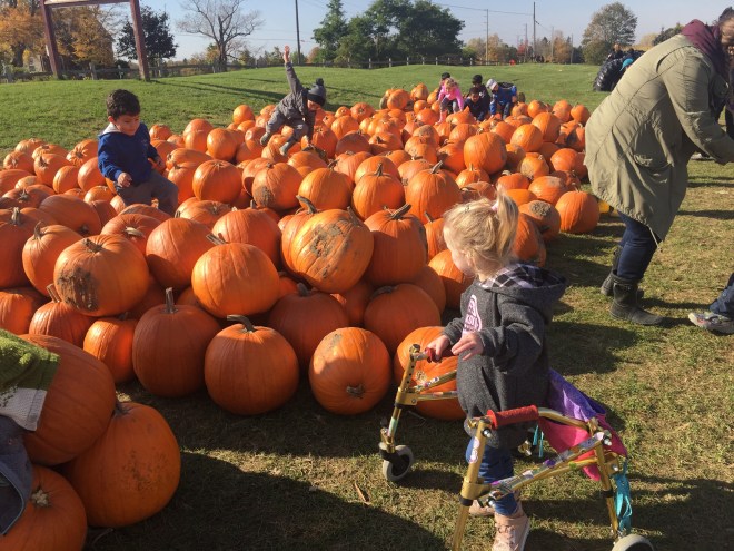 Madison was super excited this morning to hurry out the door for school. Today was her first fieldtrip! They have been learning about the growth cycle of a pumpkin at school so today they visited the pumpkin patch at Whittamores Farm. She was thrilled to go on a school bus! They had a leader tell them all about how they grow their pumpkins and then went on a hay ride around the field. They then had free time to play at the sandbox or playground and then visit with the animals. At the end they picked a pumpkin to bring home! Madison walked in her Walker for most of the trip, but had moments where she had to take breaks and leave the group to rest from all the walking. Overall it was a great experience and we will brainstorm some ideas for mobility on trips moving forward.
