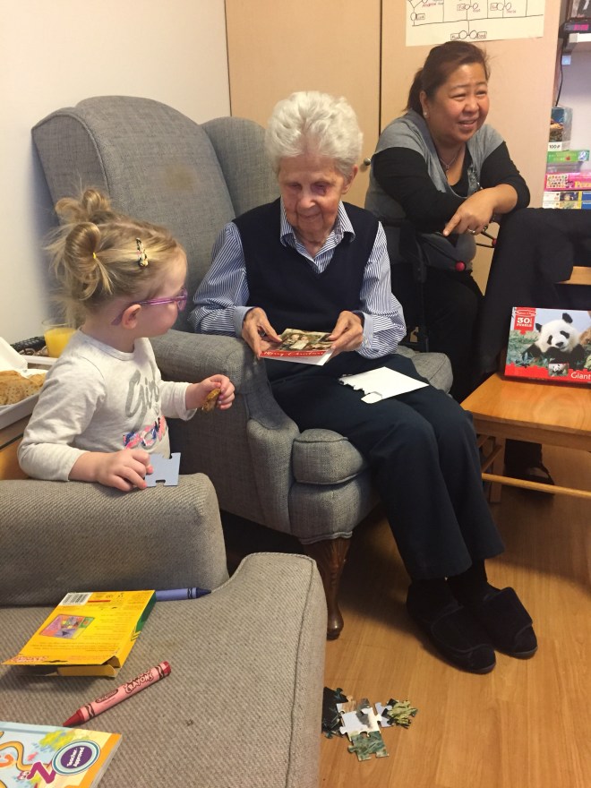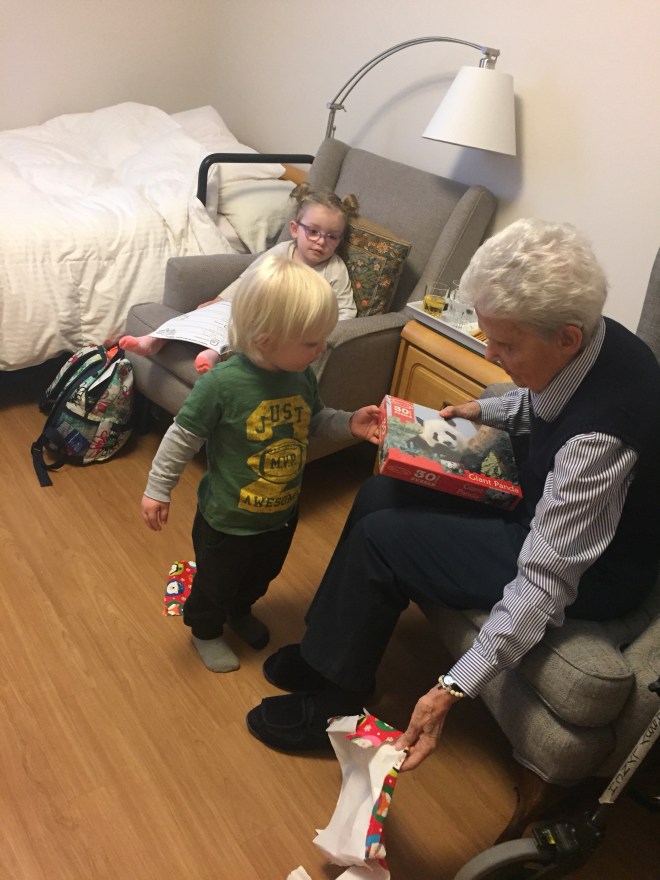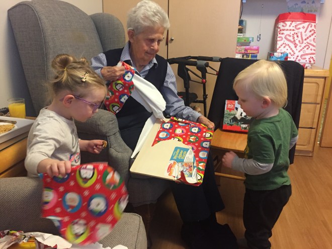 After the session, Madison and Jack went to see their Great Grandma Lynch for a holiday visit. They opened presents together and had some snacks. Madi showed Grandma her colouring and Jack showed her his remote control Thomas Train. It was a nice visit.