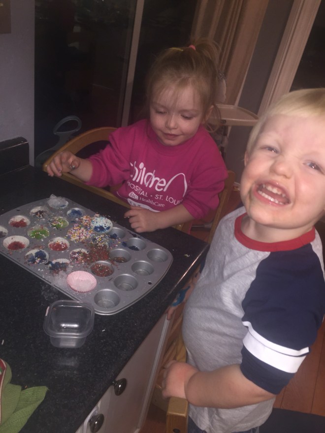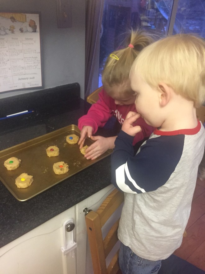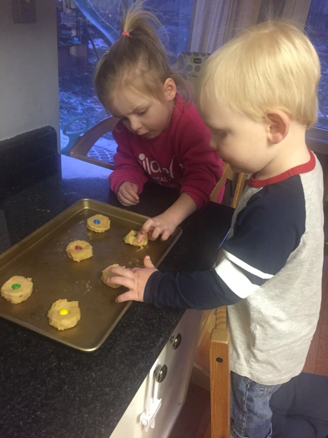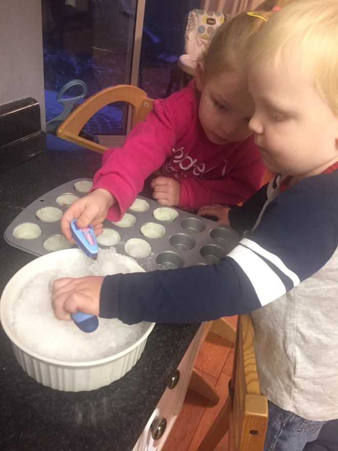 After a morning of exercise, Madi and Jack had a fun afternoon of playing which included baking cookies and making ice cupcakes for the snow elves in the backyard.