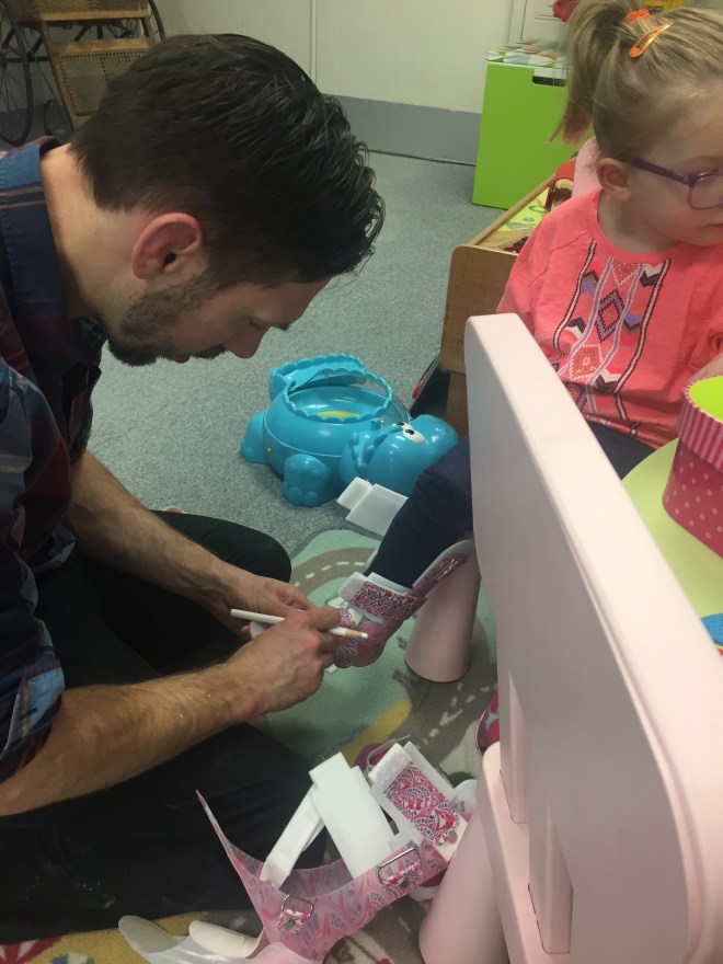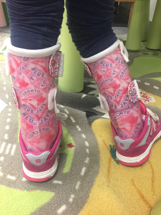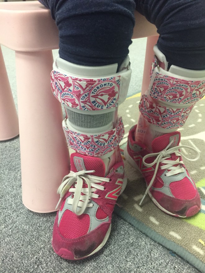 Madi went for a visit to see Eric after school today. She is 9 months post op and has already grown out of her AFO’s from St Louis. Eric figured out a way to create an inset that can be used in her AFO’s and SMO’s – so clever! After much thought and debate, she will be mostly using her solid AFO’s to develop her walking and use her SMO’s to develop strength. We will not have a hinge on her AFO at this time due to her crouch in her gait. She also has heel wedges in her shoes to help her balance shift forward. She loves the new pattern….pink Blue Jays logos on her AFO’s and also the straps! Thanks Eric!!!